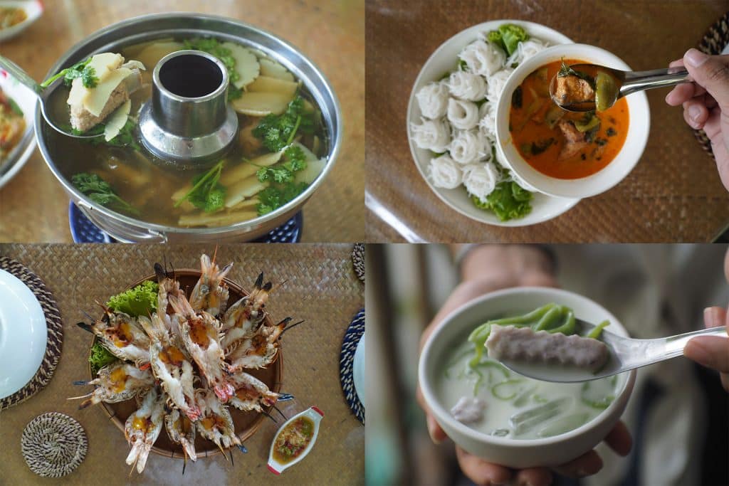 จุดขึ้นเรือคือที่ตั้งของวิสาหกิจชุมชนเสื่อกกบ้านบางพลวงและที่นี่ก็เป็นจุดกินข้าวกลางวันเช่นกัน อาหารมื้อนี้จะทำมาจากผลผลิตในท้องถิ่นตามฤดูกาล เช่น กุ้งแม่น้ำเผา ปลาทอดสมุนไพร แกงจืดหน่อไผ่ตง ขนมจีนแกงเผ็ด ห่อหมกและขนมหวาน บอกได้เลยว่าอร่อยมาก (ต้องจองล่วงหน้า 1 วัน)