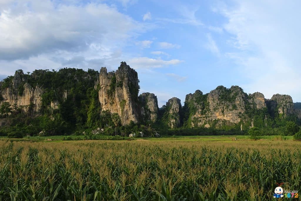 ในตอนนั่งรถกลับ จะเป็นการชมเส้นทางภูเขาหินรอบเนินมะปรางในอีกเส้นทาง ซึ่งคุณตุ่นเล่าให้ฟังว่า ภูเขาหินที่เรียงกันเนี่ย ยาวถึง 13.5 กิโลเมตรเลยนะ แต่หากใครมาช่วงเย็นอาจต้องทำเวลาหน่อย เพราะในเวลาประมาณ 18.00 น. เป็นช่วงเวลาหากินของค้างคาว ซึ่งจุดชมค้างคาวก็ไม่ใช่ที่ไหน ตรงจุดแลนมาร์คที่ขึ้นรถกันนี่แหละ ในช่วง 15-20 นาทีแรกจะเห็นค้างคาวบินออกมาเยอะมากและค่อย ๆ ดูบางตาลงในช่วงเวลา 19.00 น.