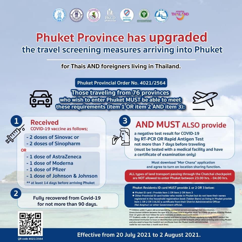 Phuket Province has upgraded the travel screening measures arriving into Phuket for Thais AND foreigners living in Thailand alike. With effect from 20th July 2021 until 2nd August 2021***