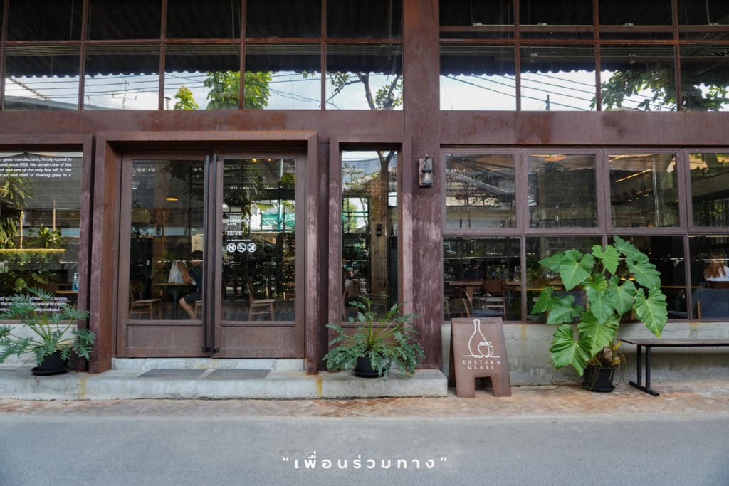 ส่วนด้านหน้าโรงงาน คือคาเฟ่ Eastern Glass ที่สวยเท่ บรรยากาศดี ชวนให้อยากเข้าไปนั่งจิบกาแฟ พื้นที่ส่วนนี้เคยเป็นออฟฟิศ ก่อนจะรีโนเวทใหม่เป็นคาเฟ่ สไตล์อินดัสเตรียล มีความดิบเท่ด้วยเครื่องมือเครื่องใช้เก่าแก่ที่ปลดระวางจากโรงงานเป่าแก้ว เป็นการนำอดีตมาตกแต่งร้านได้น่าสนใจและลงตัวมากเลย