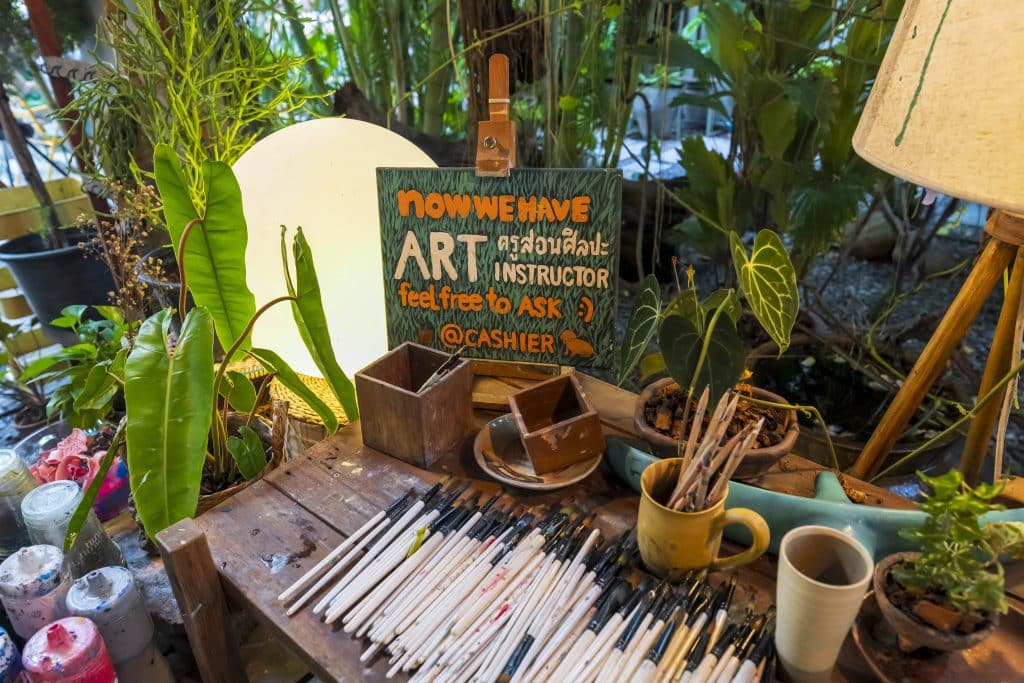 ร้านสุดชิคริมแม่น้ำเจ้าพระยา เหมาะสำหรับการหามุมสงบเพื่อสร้างแรงบันดาลใจและเพลิดเพลินไปกับการสร้างสรรค์ศิลปะ ไม่ว่าจะเป็นการวาดรูปบนเฟรมผ้าใบ สร้างผลงานศิลปะในแบบคุณ หรือจะทำเทียนหอมพร้อมกับการเพนต์ลวดลายบนแก้วเซรามิกที่จะมีชิ้นเดียวในโลกและไม่เหมือนใคร