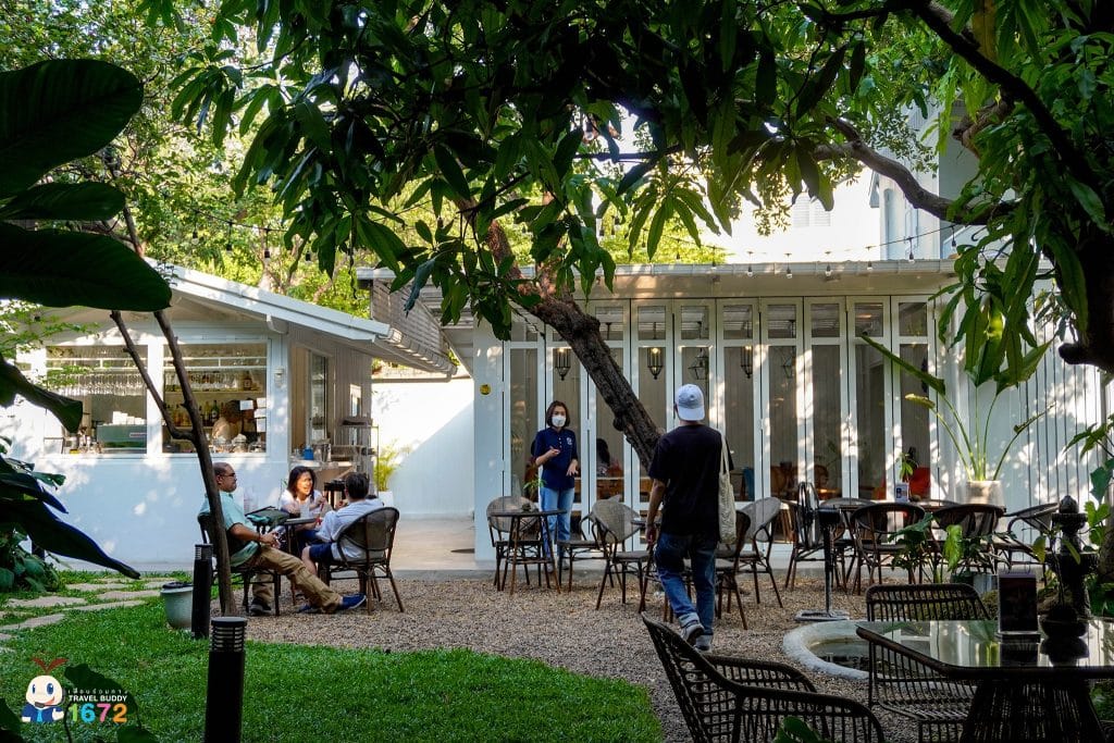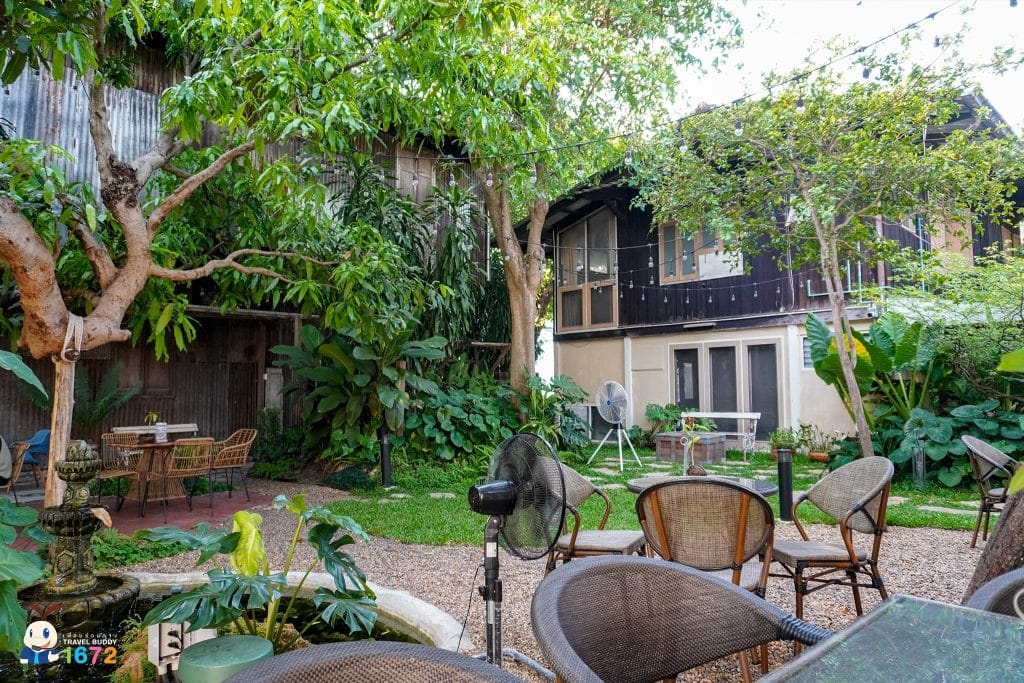 เดินเข้ามาด้านในตัวร้าน ตั้งอยู่ท่ามกลางสวนอันร่มรื่น มีมุมให้เลือกนั่งทั้งโซนด้านในห้องกระจก และโซนด้านนอก มีต้นไม้ให้ร่มเงา