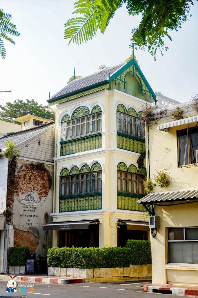 เราจะพาเพื่อน ๆ มาเดินเข้าฝั่งถนนบำรุงเมืองเพื่อชม เดอะไนท์เฮ้าส์ (The Knight House) อาคารสีเหลืองหลังคาจั่ว ลายฉลุแบบเรือนขนมปังขิง ผสมผสานศิลปะแบบโคโลเนียลเข้าด้วยกัน