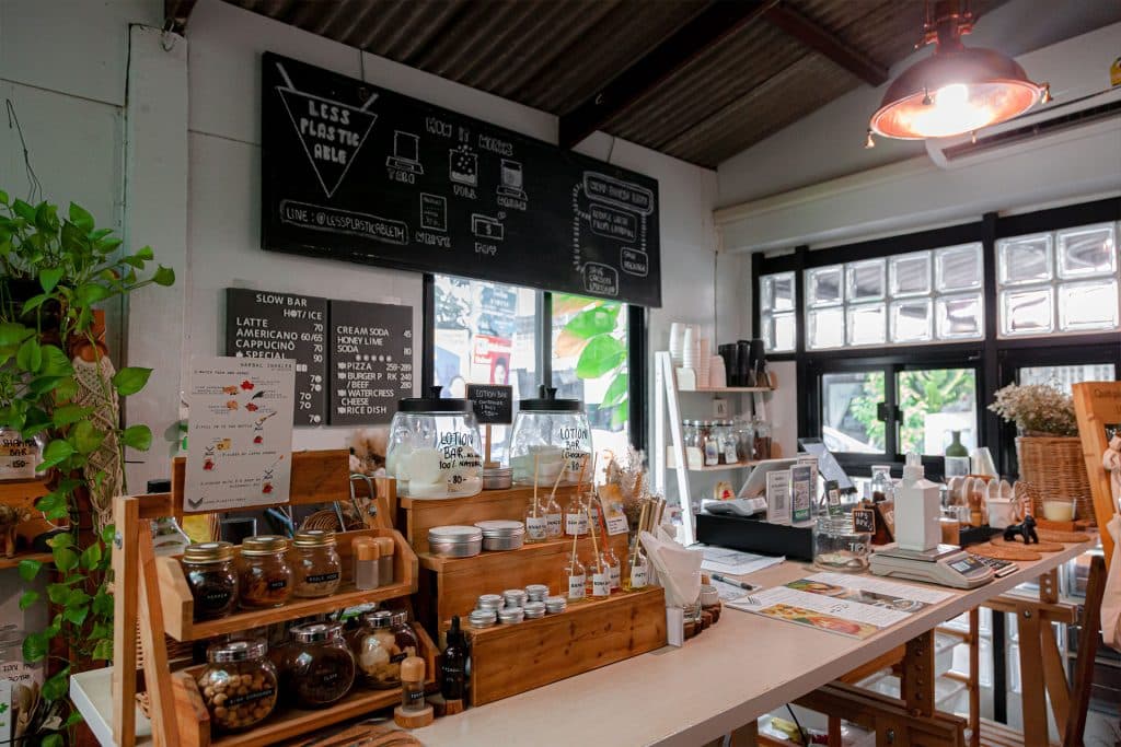 นอกจากนี้ ที่นี่ยังมีร้านคาเฟ่เล็ก ๆ “Lessplasticable” ที่จำหน่ายสินค้าเพื่อลดการใช้พลาสติก เช่นของใช้และน้ำยาต่าง ๆ แบบรีฟิล เพื่อน ๆ สามารถเตรียมภาชนะจากบ้านไปเติมได้เลย แถมที่นี่ยังมีอุปกรณ์อย่าง Bio Trash ที่เป็นการแยกขยะ กำจัดเศษอาหารให้กลายเป็นปุ๋ยใส่ต้นไม้ด้วยการนำเศษอาหารใส่กับตัวสตาร์ทเตอร์หมักไว้ประมาณ 45 วันก็นำมาใช้งานได้แล้ว สำหรับใครที่สนใจทำกิจกรรม Workshop การปลูกผัก สามารถติดต่อล่วงได้เลย เพราะที่นี่รับจำนวนจำกัดต่อวัน