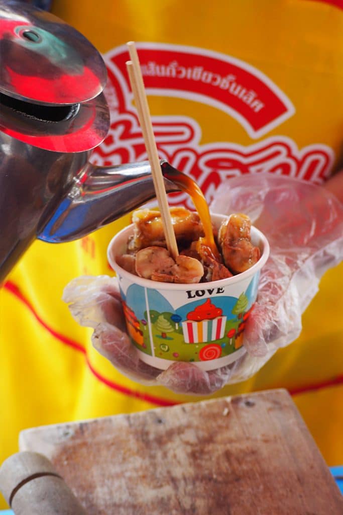 ร้านแรกเป็นร้านกระหรี่ปั๊บเจ้าดังในย่านตลาดน้อย ที่หมดไวถึงขนาดหลายคนต้องโทรมาจองล่วงหน้า โดยเฉพาะไส้ไก่