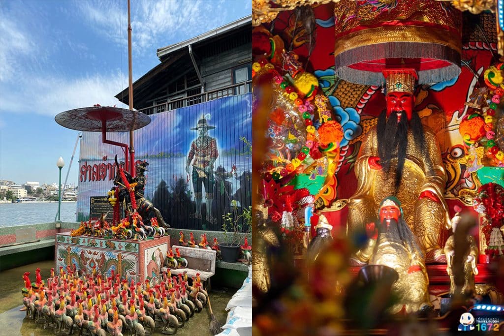 บริเวณริมน้ำด้านหน้าศาล เพื่อน ๆ จะพบรูปปั้นสักการะสมเด็จพระเจ้าตากสิน หันหน้าออกไปทางแม่น้ำเจ้าพระยา ว่ากันว่า สมเด็จพระเจ้าตากสินเคยเสด็จมาสักการะเทพเจ้ากวนอูที่ศาลเจ้าแห่งนี้ก่อนจะกรีธาทัพไปทำสงคราม นี่จึงเป็นที่มาของรูปปั้นสักการะดังกล่าว