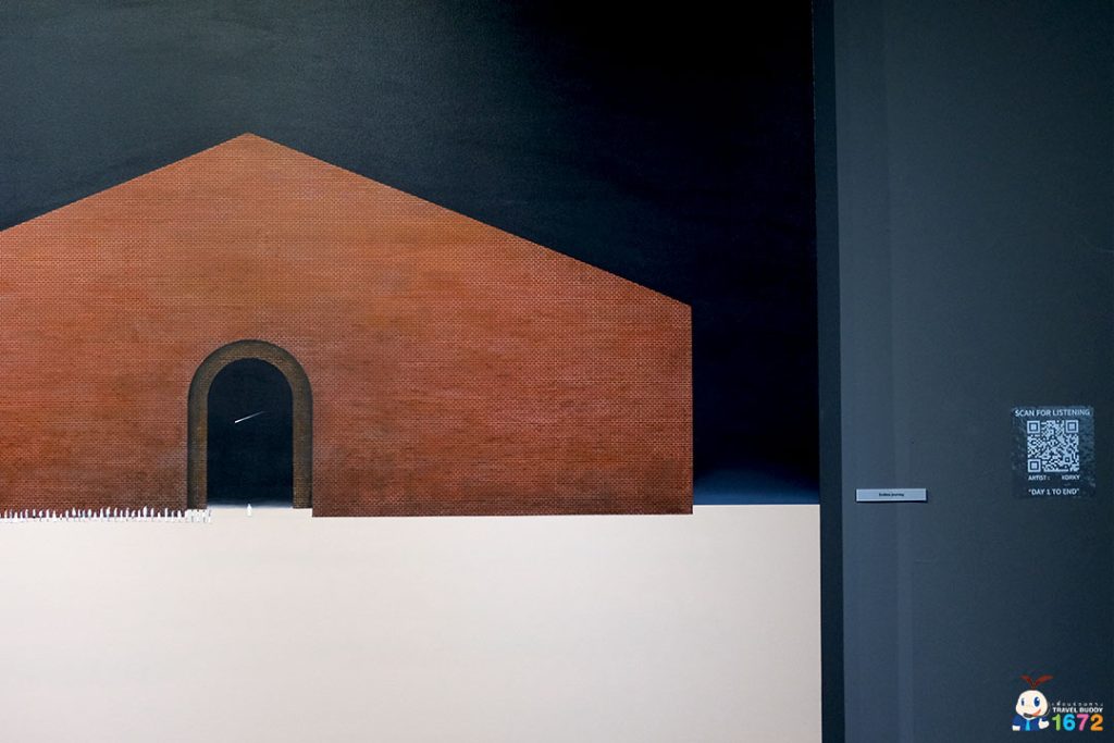 บริเวณทางเข้า จะมี QR Code ที่ภายในมีเพลงที่แต่งขึ้นมาเฉพาะสำหรับนิทรรศการนี้ให้สแกนฟัง สำหรับผู้ที่ต้องการเพิ่มอรรถรสในการชมให้มากขึ้นหรืออาจต้องการตัดขาดจากโลกภายนอกระหว่างชมนิทรรศการ เพื่อน ๆ สามารถสแกนแล้วใส่หูฟังได้เลย ซึ่งเพลงที่จะได้ฟังมีชื่อว่า Day 1 to End เป็นเพลงบรรเลงยาว 9:23 นาที ที่มอบจินตนาการทั้งสุขและเศร้าผ่านโสตประสาท ระหว่างที่เราชมภาพในนิทรรศการ