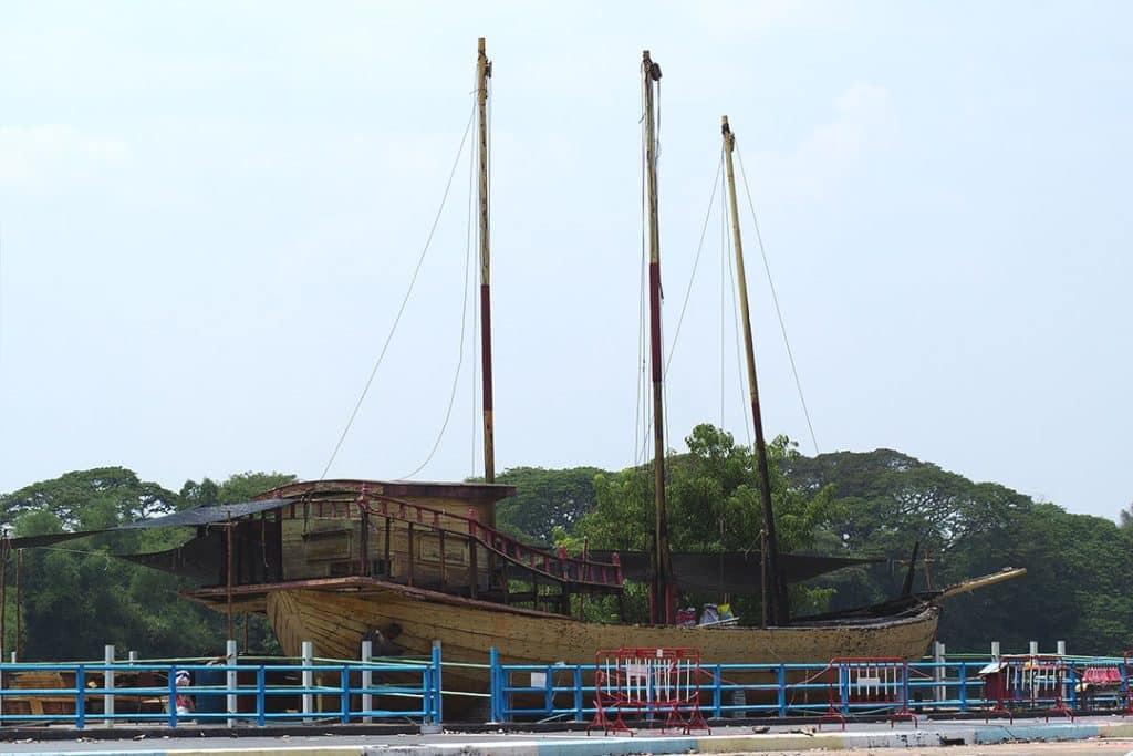 ด้านหน้าศาลเจ้าพ่อกวนอูยังมี “เรือสำเภาทองยักษ์” อายุกว่า 70 ปี ถูกกู้ขึ้นมาจากแม่น้ำเจ้าพระยาช่วงสร้างเขื่อนเจ้าพระยา ก่อนจะนำมาบูรณะซ่อมแซมใหม่ด้วยไม้สักและทาสีทองใหม่ทั้งลำ