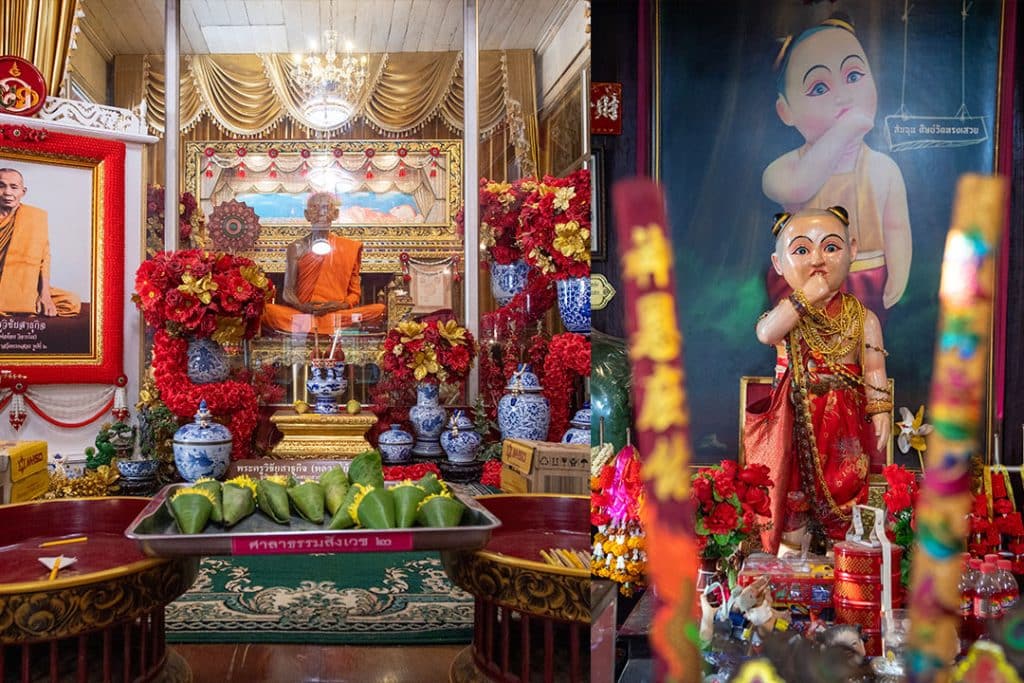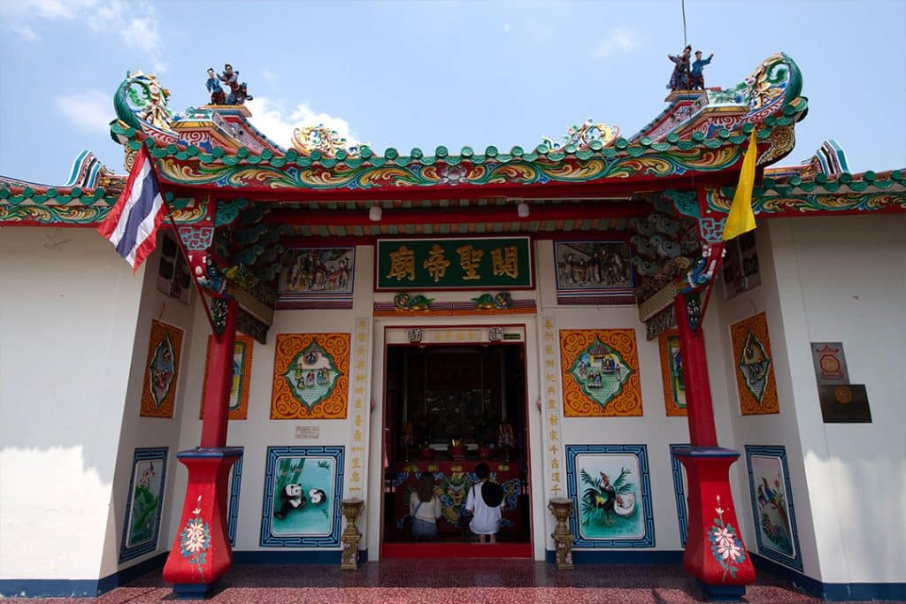 สถานที่ถัดมา เป็นศาลเจ้าจีนเก่าแก่ที่อยู่คู่กับชาวมโนรมย์มากว่า 200 ปี ทั้งซุ้มประตูไม้แกะสลักรูปตุ๊กตาชาวจีน ภาพเขียนและสีสันของศาลเจ้ายังสวยงามอยู่จนถึงปัจจุบันจากการดูแลอย่างดี ภายในศาลเจ้า เพื่อน ๆ จะพบเจ้าพ่อกวนอูที่แกะสลักจากไม้ พร้อม 2 องครักษ์ขนาบซ้ายขวา สามารถขอพรเกี่ยวกับการงาน คดีความ ขายที่ดิน การประกอบกิจการ ให้มีความก้าวหน้าเจริญรุ่งเรืองได้