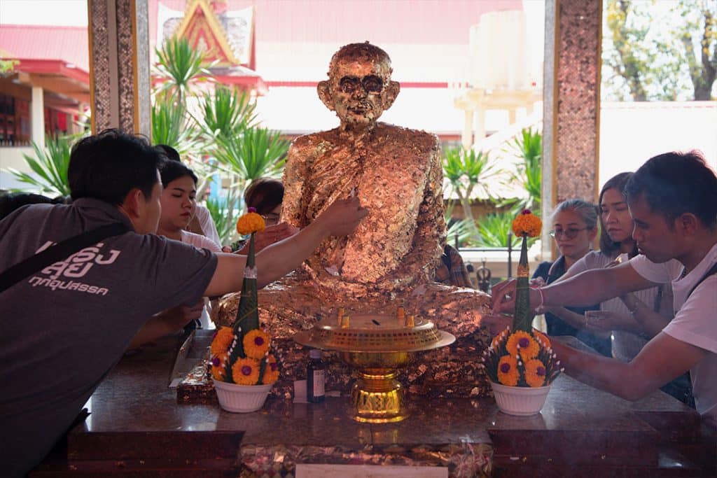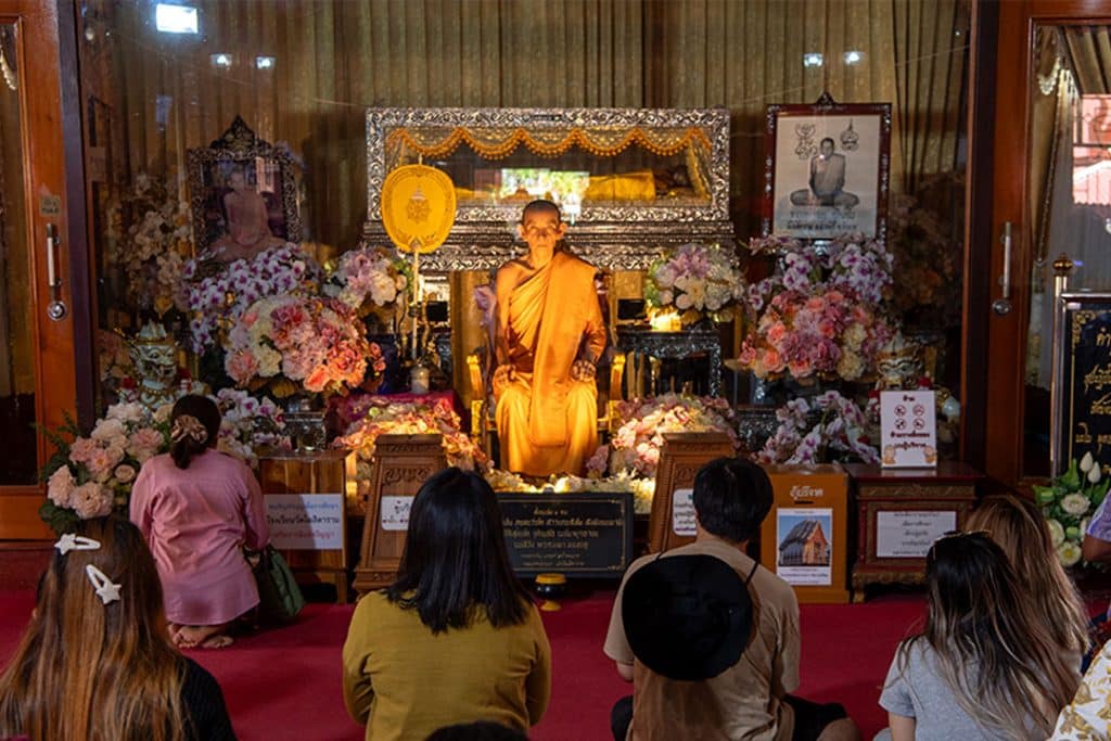 เพื่อน ๆ สามารถกราบไหว้รูปหล่อหลวงพ่อกวยได้ทั้งที่ศาลาด้านหน้าและสรีรสังขารของหลวงพ่อกวยบริเวณอุโบสถด้านใน เพื่อให้ท่านช่วยคุ้มกันภัย แก้ดวงตก รอดพ้นอุปสรรคต่าง ๆ เสริมเรื่องหน้าที่การงาน โชคลาภ และสามารถนำน้ำมนต์ของทางวัดกลับไปได้ ทางวัดมีเพียงข้อห้ามเดียวคือ ห้ามนำวัตถุมงคล เครื่องรางของขลังทุกรูปแบบ มาทำพิธีหรือวางเพื่อปลุกเสกในทุกกรณี
