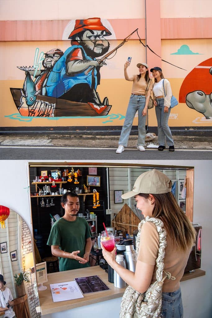 เนื่องจากศาลเจ้าพ่อกวนอู ตั้งอยู่ในชุมชนคุ้งสำเภา เพื่อน ๆ สามารถเดินชมสตรีตอาร์ตตามอาคารบ้านเรือนได้ โดยภาพบนผนังจะบอกเล่าเรื่องราวเกี่ยวกับธรรมชาติและวิถีชีวิตของชาวมโนรมย์ หากเหนื่อยก็สามารถนั่งพักที่ร้านอาหารและร้านกาแฟน่ารัก ๆ ตามถนนได้เลย