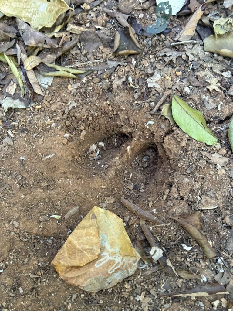 วันที่บัดดี้ไป บัดดี้ได้เจอรอยเท้าของสัตว์ป่าด้วย เพื่อน ๆ ทายกันได้ไหมเอ่ย ว่านี่คือรอยของสัตว์ชนิดใด เฉลย รอยเท้าของกระทิง นั่นเอง และนี่เป็นหลักฐานว่าเส้นทางนี้มีกระทิงผ่านมาจริง ๆ