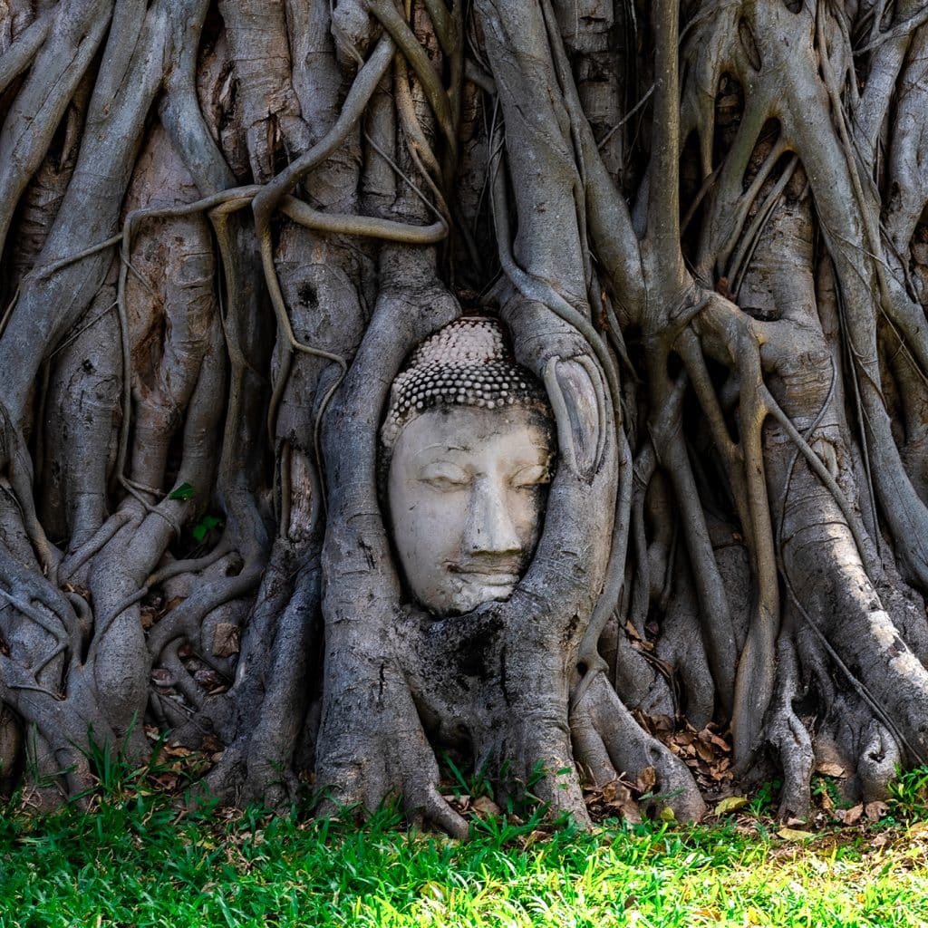 เศียรพระพุทธรูปหินทรายซึ่งมีรากไม้ปกคลุม สันนิษฐานว่าเศียรพระพุทธรูปองค์นี้อาจจะตกลงมาอยู่ที่โคนต้นไม้ ดูแปลกตาและงดงาม ทำให้นักท่องเที่ยวต่างมาสักการะและชื่นชมเป็นอย่างมาก