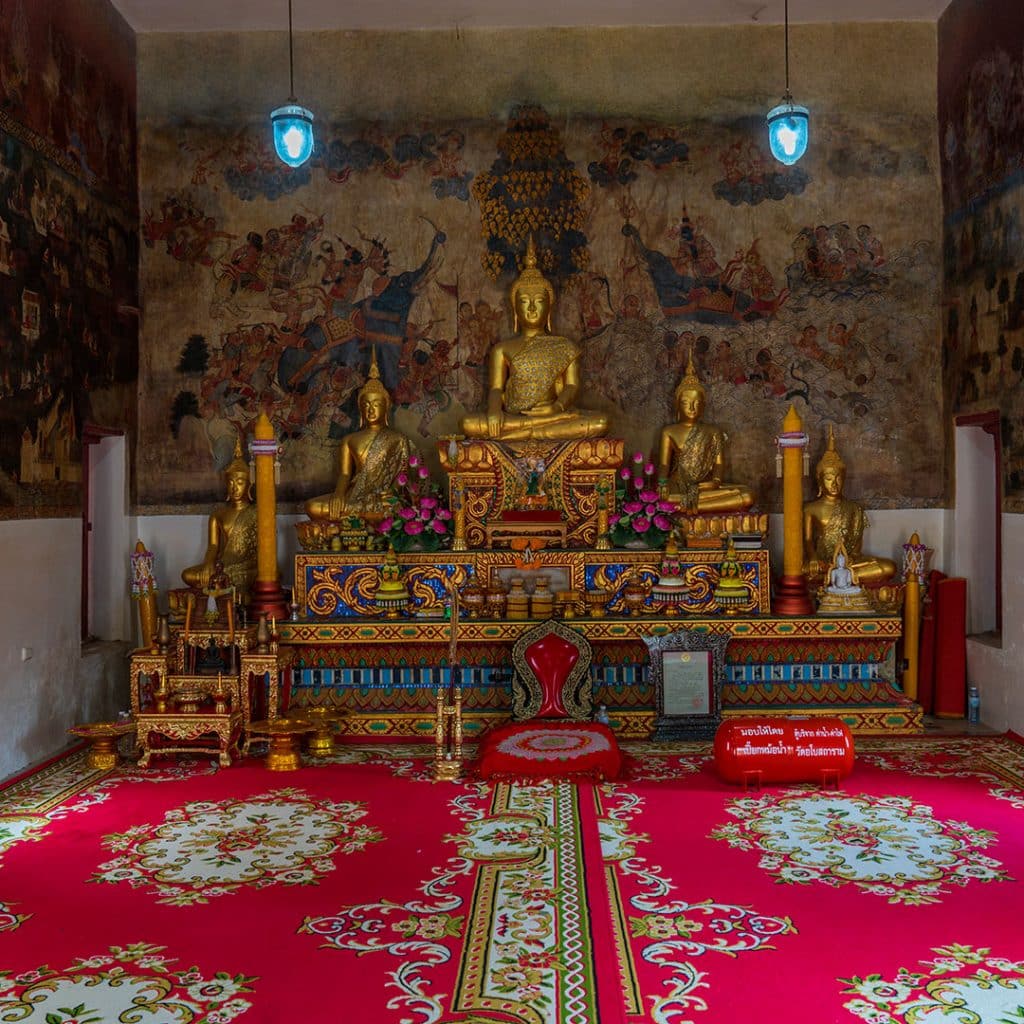ไฮไลต์ของวัดนี้ คือพระอุโบสถรากไม้ ที่เกิดจากการนำรากไม้กันเกรามาทำเป็นฝาผนัง ดูสวยแปลกตา แถมยังมีลมพัดผ่านเข้ามาเรื่อย ๆ ทำให้อากาศถ่ายเท เย็นสบาย พระประธานและท้าวเวสสุวรรณคู่หน้าพระอุโบสถทำจากไม้ตะเคียนทอง สวยงามอลังการไม่แพ้กัน