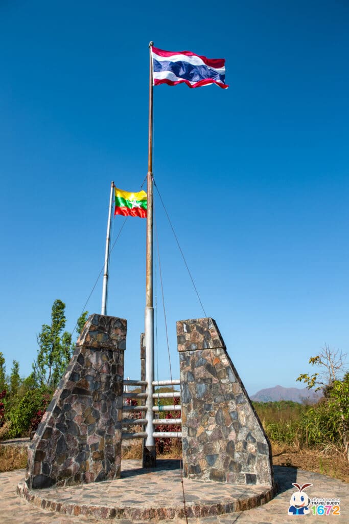 ห่างจากหมู่บ้านไป 2 กิโลเมตร แอดจะพาเพื่อน ๆ ไปชมวิวสุดเขตแดนสยามที่ “เนินเสาธง” ยอดเขาที่มีธงระหว่างสองประเทศ ไทย-เมียนมา ตั้งเด่นอยู่ข้างกัน เรียกกันว่า “จุดประสานสัมพันธ์ไมตรีนิจนิรันดร์ ไทย-เมียนมา” เพื่อน ๆ สามารถชมพระอาทิตย์ขึ้นและตกได้จากจุดนี้