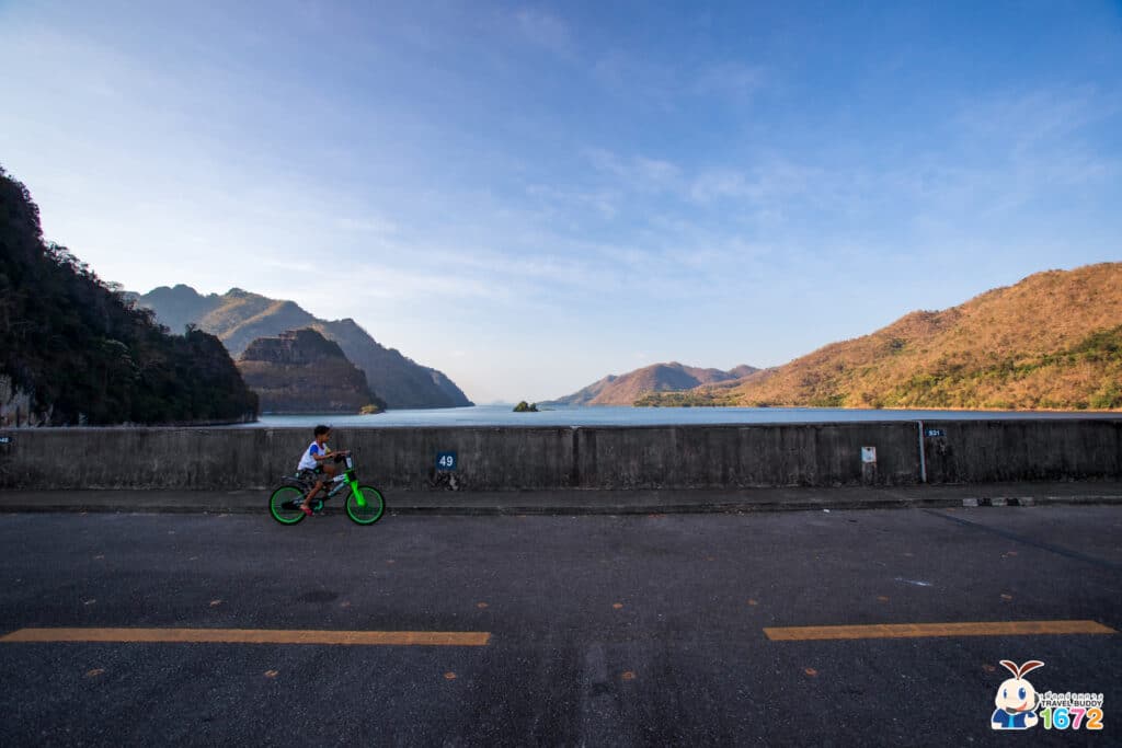 ถัดมาแอดจะพาไปปั่นจักรยานเล่นที่สันเขื่อน ซึ่งอยู่ห่างจากสกายวอล์กไปประมาณ 3 กิโลเมตร ถนนสันเขื่อนนี้กว้างถึง 10 เมตร เพื่อน ๆ สามารถเช่าจักรยานของ กฟผ. ที่จัดไว้ให้มาปั่นเล่นกันได้