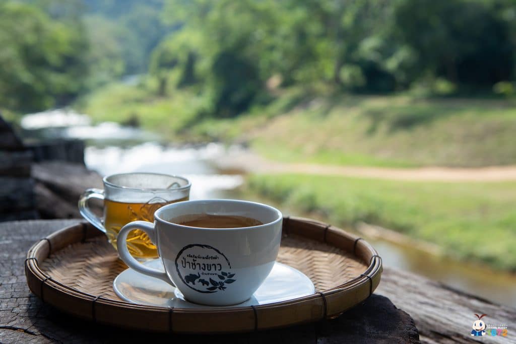 ดื่มด่ำกับบรรยากาศกันแล้ว จะพาเพื่อน ๆ ดื่มกาแฟและชาดอกกาแฟกัน เพราะที่นี่ยังมีคาเฟ่ จัดตั้งโดยวิสาหกิจชุมชนโรบัสต้าป่าช้างขาว และเป็นชื่อแบรนด์เมล็ดกาแฟที่วางจำหน่ายแก่ผู้มาเยือน รวมทั้งบนแพลตฟอร์มออนไลน์อีกด้วย หากใครชิมแล้วติดใจ หรือยังไม่เคยชิมแล้วอยากลองก็สามารถสั่งซื้อกันได้