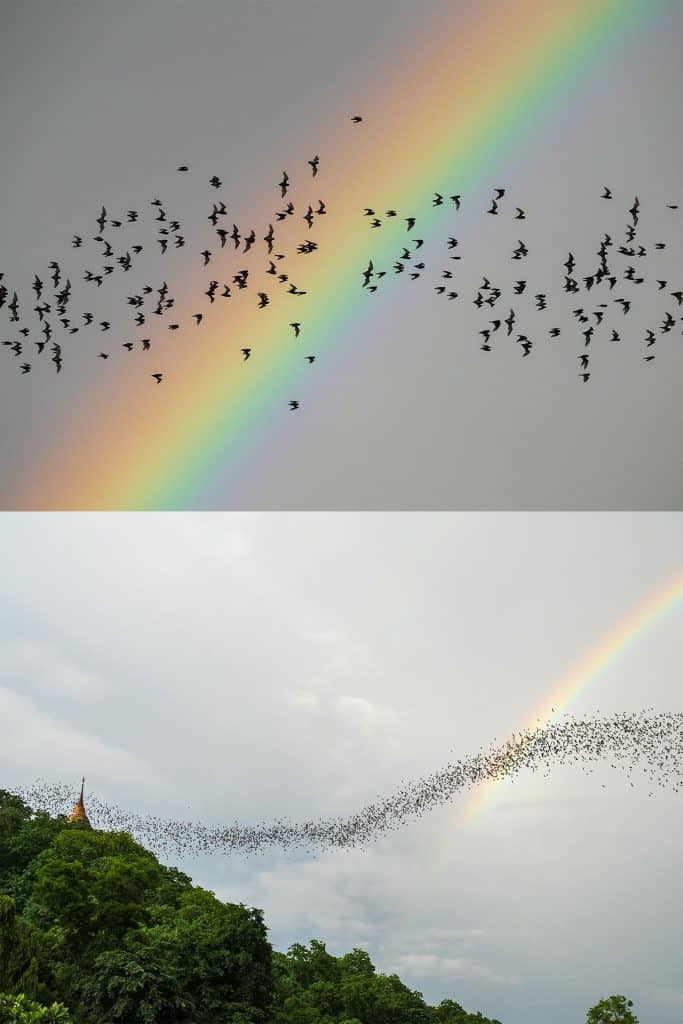 วันที่บัดดี้ไปมีฝนตกเล็กน้อย หลังจากฝนหยุดก็ได้เวลาค้างคาวบินออกมาพอดี เลยได้ดูฝูงค้างคาวบินบนฟ้าโดยมีฉากหลังเป็นสายรุ้ง สวยมาก ๆ เลยล่ะ