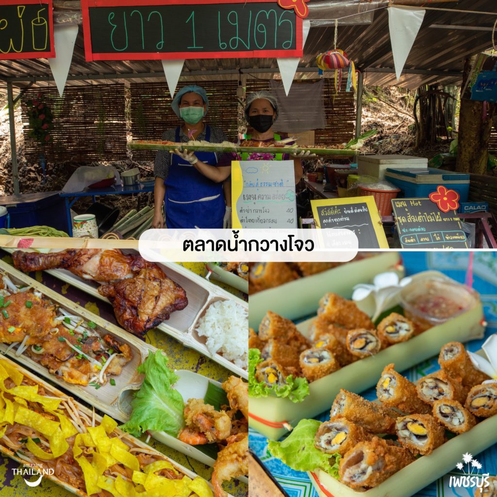ตลาดน้ำกลางป่าเเละน้ำตก ตั้งอยู่ที่น้ำตกกวางโจว มีให้บริการอาหารถิ่นเเละเครื่องดื่มที่หลากหลายอีกทั้งราคาก็ยังถูกมากด้วย เมนูเด็ดก็คือ ผัดไทมอญ พิซซ่าเตาถ่านและส้มตำ 1 เมตร บรรยากาศร่มรื่นมีแพให้นั่งฟรีสำหรับนักท่องเที่ยวที่มาเยี่ยมชม ค่าเข้าชมเพียงคนละ 25 บาทเท่านั้น ดี เธอต้องมา