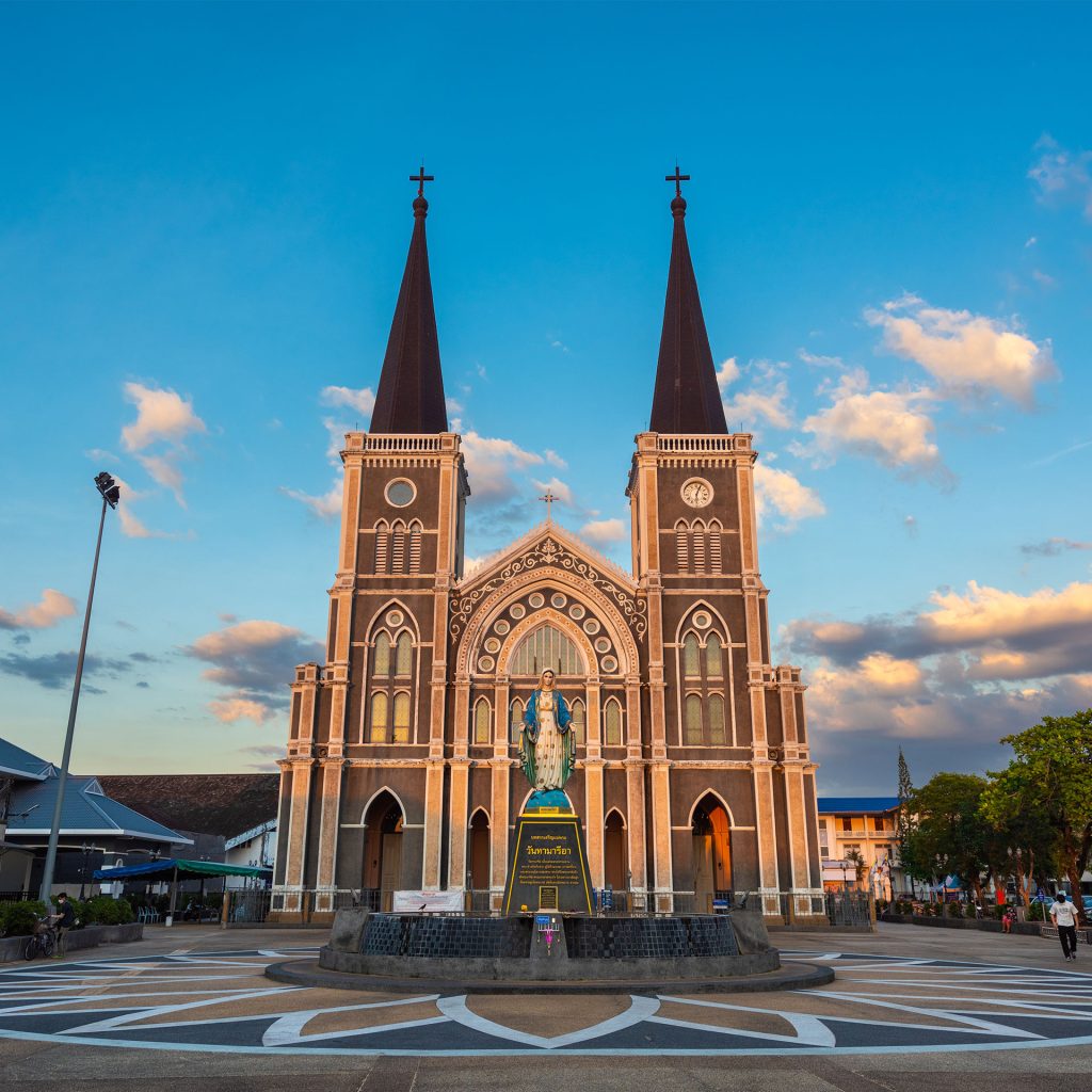 ที่นี่เป็นจุดที่ทุกคนต่างมาแวะเช็กอินถ่ายรูปเมื่อมาเที่ยวจันทบุรี… โบสถ์แห่งนี้มีประวัติการก่อสร้างยาวนานถึง 300 ปี เป็นสถาปัตยกรรมแบบกอทิก ภายในโบสถ์มีการตกแต่งด้วยศิลปะเก่าแก่อย่างกระจกสีหรือที่เรียกกันว่า สเตนกลาส เป็นภาพนักบุญต่าง ๆ โดยอายุของกระจกเหล่านี้ มีอายุกว่า 100 ปี ภายในโบสถ์มีองค์แม่พระประดับตกแต่งด้วยพลอย กว่า 200,000 เม็ด (ประมาณ 2 หมื่นกะรัต) นับได้ว่าโบสถ์คาทอลิกแห่งนี้เป็นโบสถ์ขนาดใหญ่ที่มีความเก่าแก่และมีความงดงามมากที่สุดในภาคตะวันออกอีกแห่งเลย