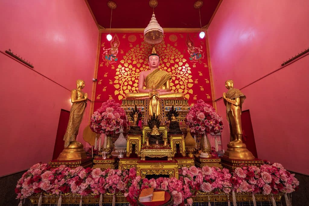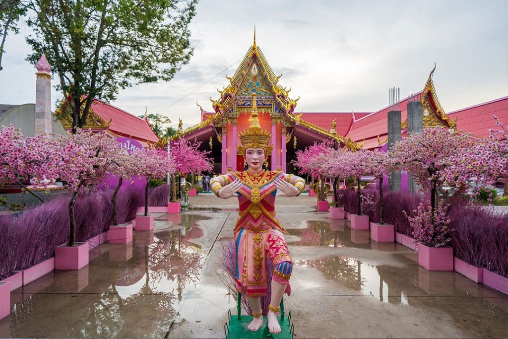 ในบริเวณวัด จะมีการตกแต่งด้วย รูปปั้นโนราห์ ดอกซากุระจำลอง ซุ้มถ่ายรูปเล็ก ๆ ให้คนที่มาถ่ายรูปได้ตามสบายใจ