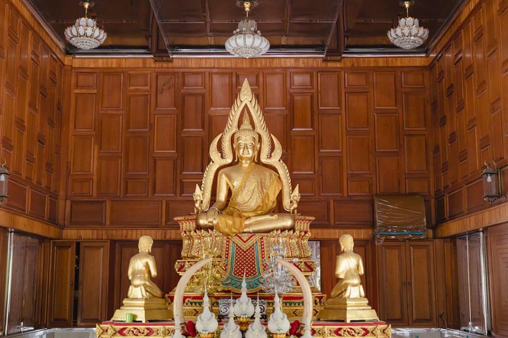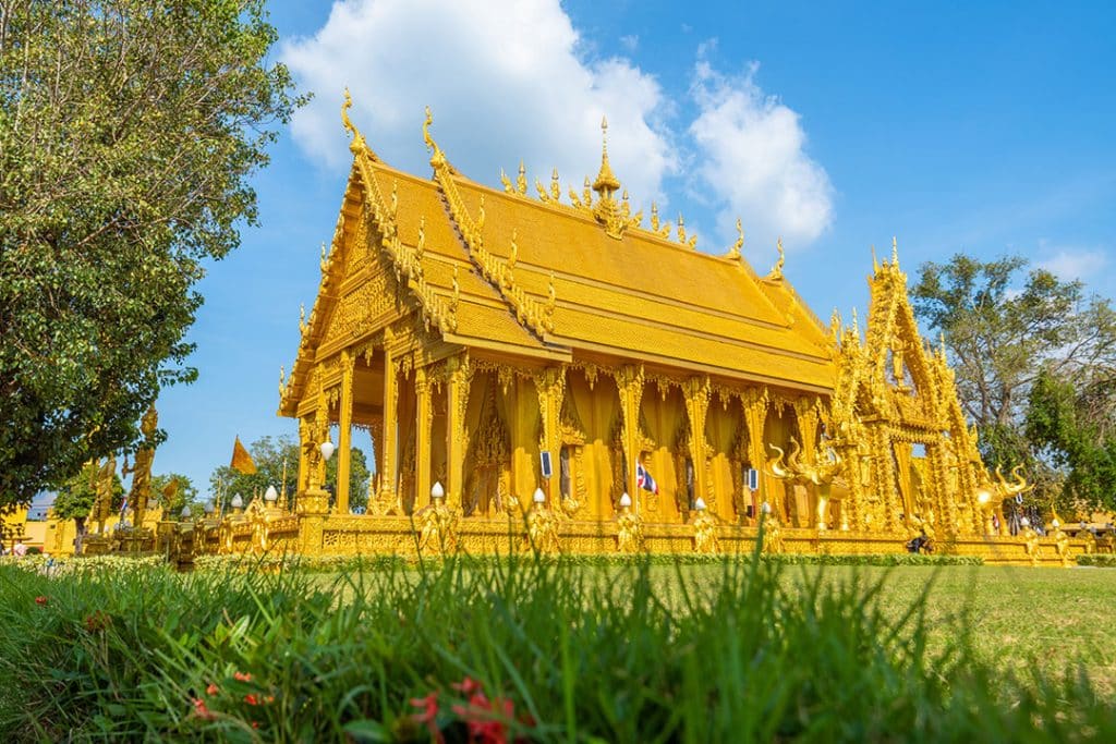 จุดเด่นของวัดนี้ คือ พระอุโบสถสีทอง ที่ทาสีทองทั้งภายในและภายนอกตัวอุโบสถ หลังคาของอุโบสถประดับด้วยพญานาคและธรรมจักร ตรงกลางมีบุษบกยอดฉัตร กำแพงแก้วชั้นนอกตกแต่งด้วยลวดลายธรรมจักรสลับกับโคมไฟรูปช้างสามเศียร
