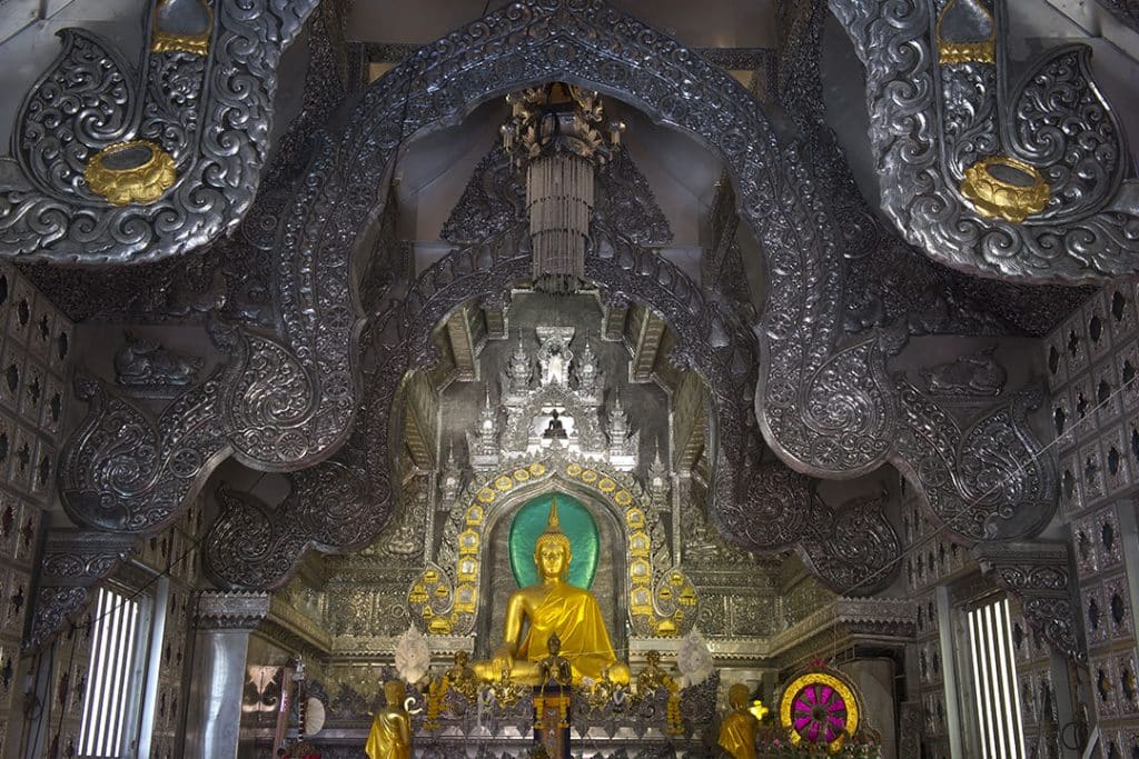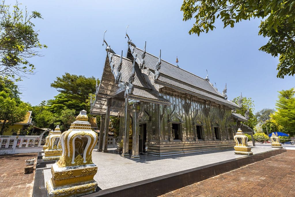 พระอุโบสถเงิน ออกแบบเป็นทรงล้านนา สร้างและตกแต่งด้วยโลหะเงินและดีบุกทั้งภายในภายนอก จากฝีมือของช่างท้องถิ่นด้านเครื่องเงินโดยเฉพาะ ภายในมีองค์พระประธาน ที่ชาวบ้านเรียกกันว่า พระเจ้าเจ็ดตื้อ เป็นพระพุทธรูปปางมารวิชัยทำจากเนื้อทองสัมฤทธิ์