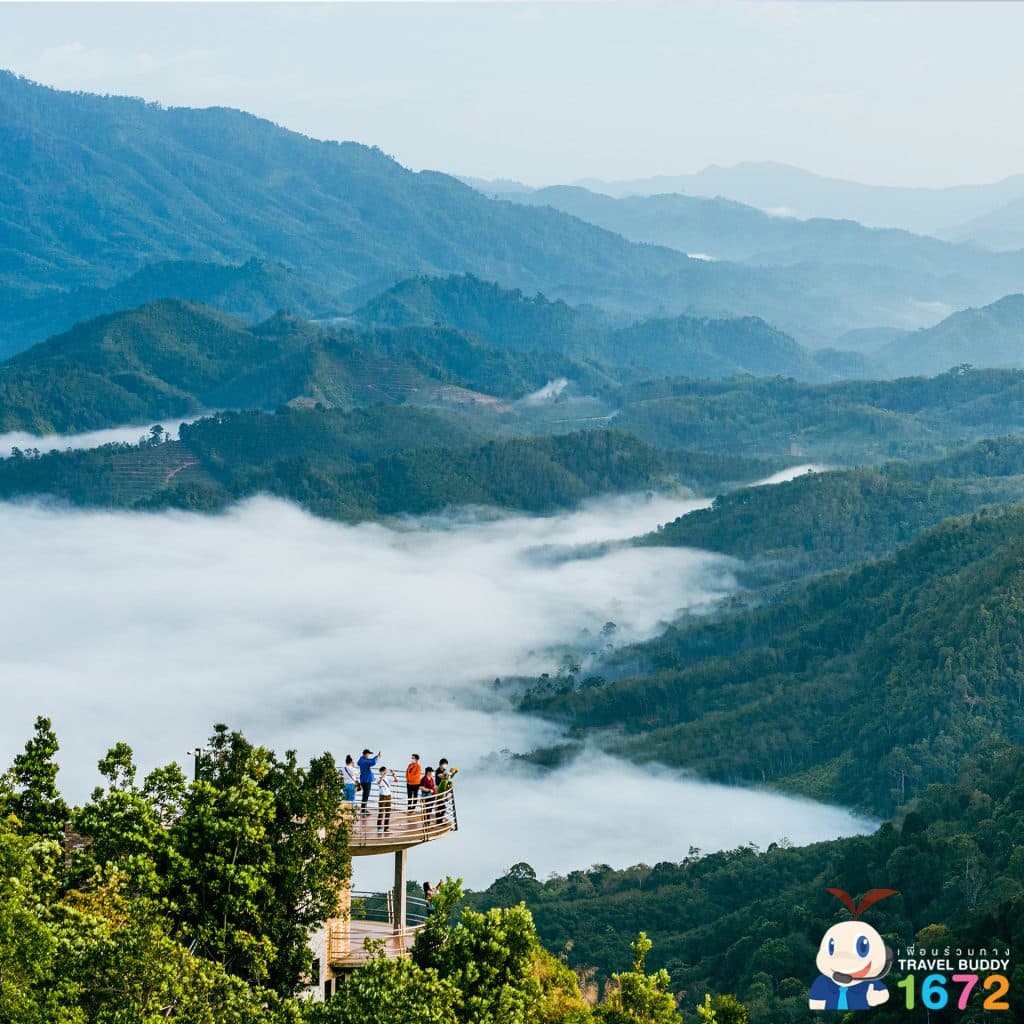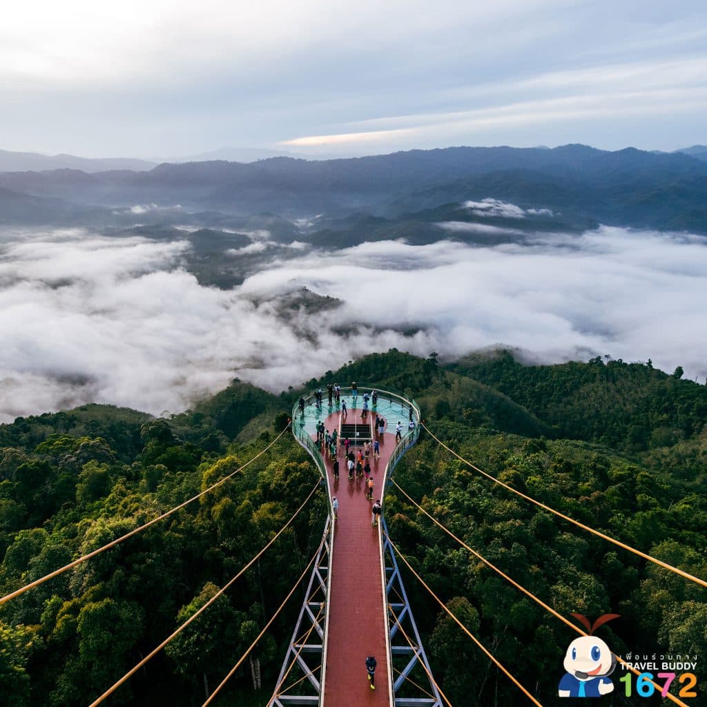 สถานที่ต่อมา อยู่ใต้สุดของประเทศไทย นั่นก็คือทะเลหมอกอัยเยอร์เวง อ.เบตง จ.ยะลา ที่นี่มี Sky walk ที่สามารถชมวิวทะเลหมอกมุมสูงและเดินไปตามระเบียงทางเดินที่ยื่นออกไปจากฐาน ส่วนปลายคือระเบียงที่มีลักษณะเป็นพื้นกระจกใส