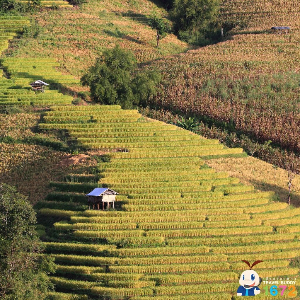 นาขั้นบันไดป่าบงเปียง หากมาหน้าฝนจะเจอภูเขาสีเขียวชุ่มฉ่ำ หากมาช่วงเริ่มหนาวจะเจอต้นข้าวสีเหลืองทองสวยงาม