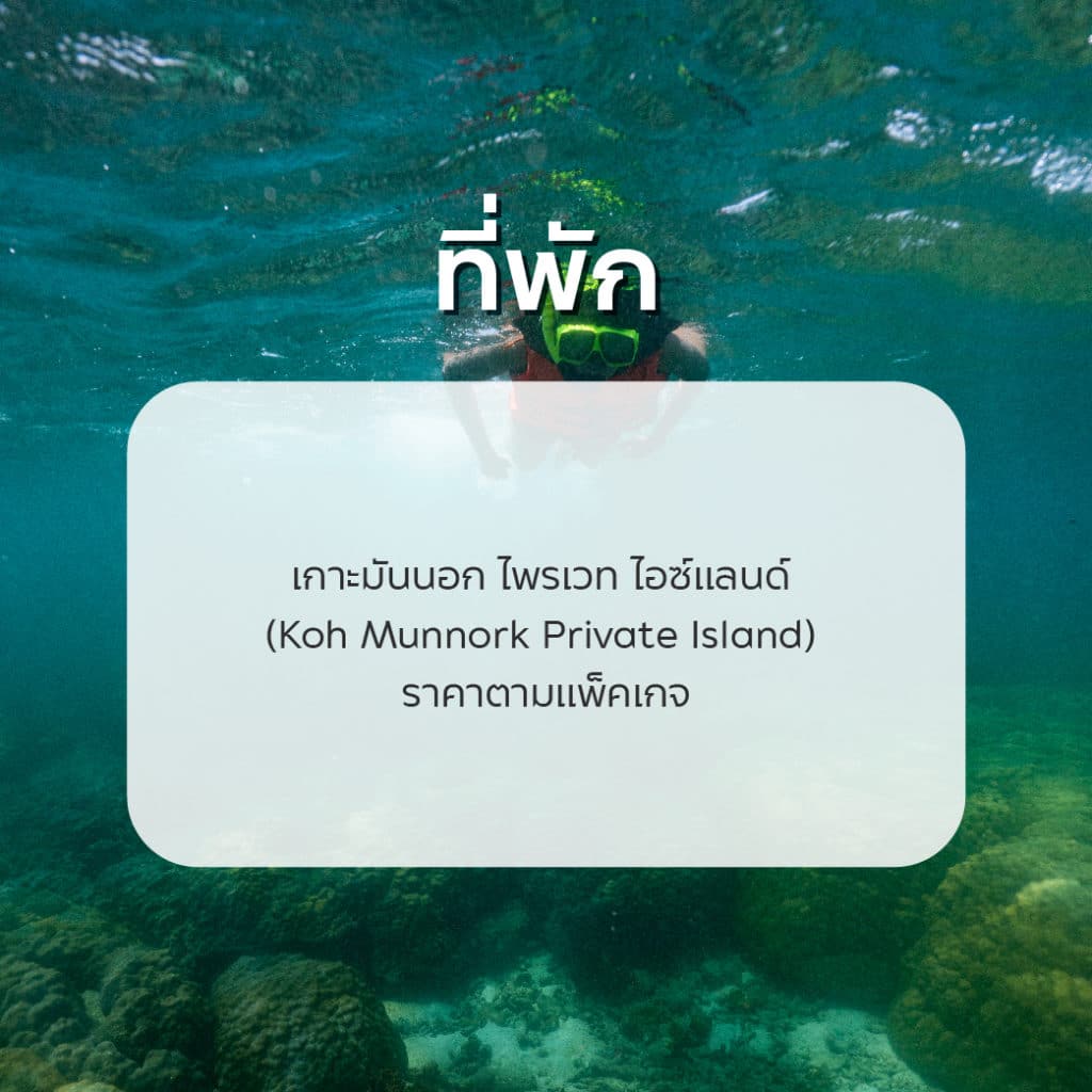 บนเกาะมีที่พักเพียงที่เดียวเท่านั้น คือ “Koh Munnork Private Island” ห้องพักมีความเป็นส่วนตัว มีห้องอาหาร สระว่ายน้ำให้บริการ ส่วนกิจกรรมที่ห้ามพลาด คือ การดำน้ำตื้นดูปะการัง สำหรับใครที่ชื่นชอบการพักผ่อนแบบส่วนตัวและต้องการทำกิจกรรม ต้องลองมาสัมผัสด้วยตัวเองดูสักครั้ง