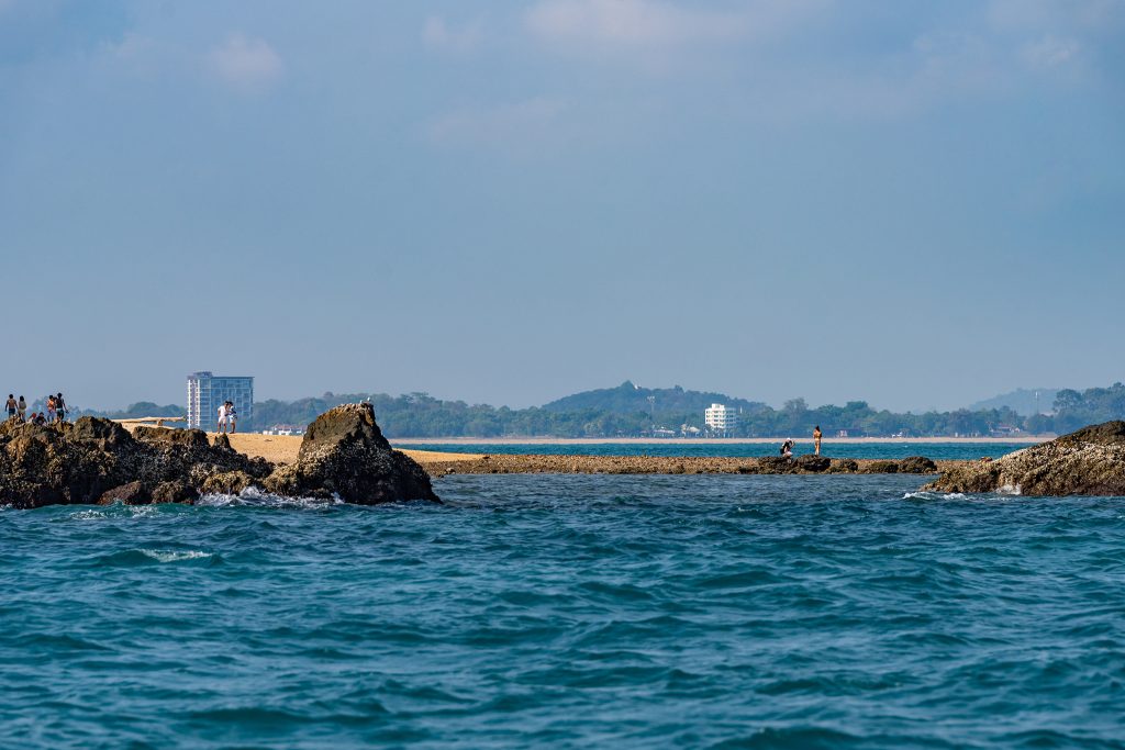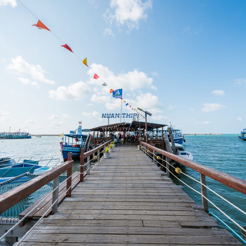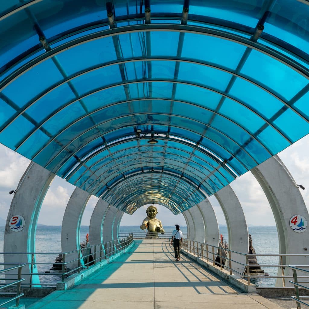 ขอเริ่มต้นทริปกันที่จุดท่าเรือเพื่อข้ามไปยังท่าเรือหน้าด่านบนเกาะเสม็ด ซึ่งจะมีเรือให้เลือกตั้งแต่เรือช้า เรือเร็ว หรือ Speed Boat ตามความสะดวก เมื่อข้ามมาถึงแล้ว สิ่งแรกที่คิดว่าทุกคนต้องทำคือ หยิบมือถือขึ้นมาเช็กอินกับรูปปั้นนางยักษ์ หรือที่บางคนเรียกกันว่านางผีเสื้อสมุทร ที่ตั้งสูงตระหง่านอยู่ในทะเลบริเวณหัวสะพานท่าเทียบเรือของเกาะ