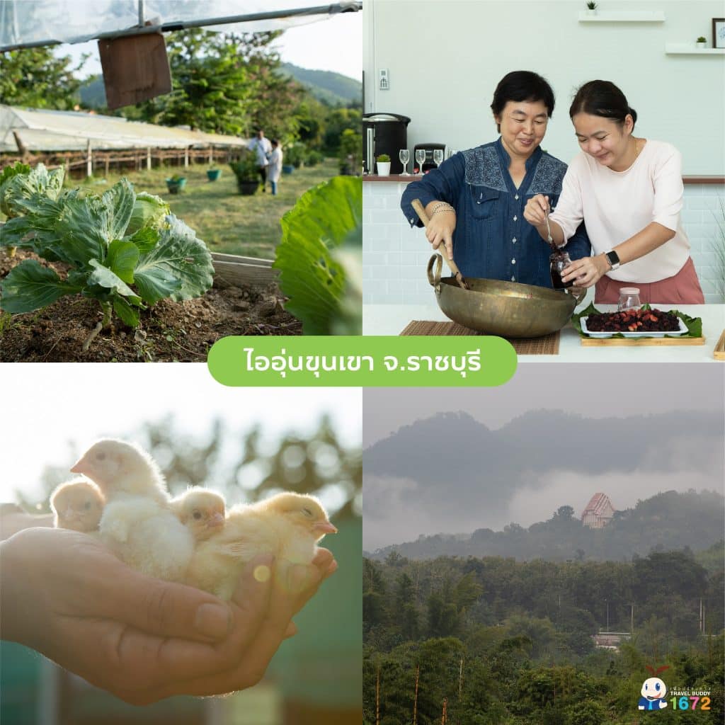 📌 ไออุ่นขุนเขา จ.ราชบุรี – มาสร้างสุขภาพดีที่ฟาร์มออร์แกนิก มีผักแทบทุกชนิดไม่ต้องซื้อ สามารถเก็บในสวนมาทำกินได้เลย บรรยากาศเงียบสงบ จำลองการเป็นชาวสวนย่อม ๆ ปลูกผัก เก็บไข่ และได้รับออกซิเจนจากภูเขารอบข้าง