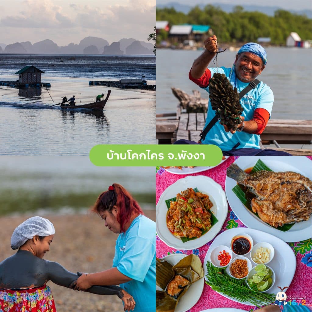 📌 บ้านโคกไคร จ.พังงา – หมู่บ้านริมทะเลที่ใช้ทรัพยากรธรรมชาติได้อย่างยั่งยืน ชิมอาหารทะเลที่ชาวประมงหามาเอง เช่น ปลาตัวใหญ่ ๆ นำมาปรุงอาหารอร่อย ๆ ให้เราได้ชิม มีกิจกรรมสปาโคลนแสนผ่อนคลายกับน้ำทะเลอุ่น ทรายร้อน บรรยากาศเงียบสงบ มองออกไปไกล ๆ ขอบทะเลมีภูเขาลูกเล็ก ๆ มากมายเรียงรายสลับกันอยู่