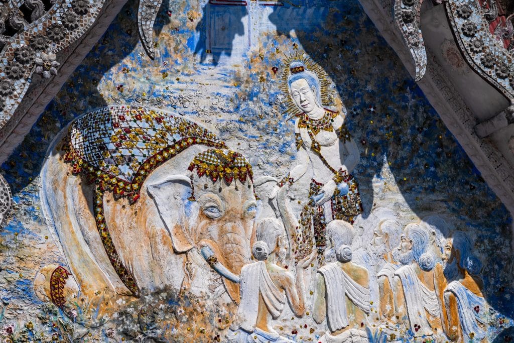 - เจดีย์กระจกแก้ว เจดีย์ขนาดใหญ่ที่มีพญานาคโอบรอบตัวเจดีย์ 1 คู่ หน้าประตูมีพญางู 1 คู่และพระพุทธเจ้า 5 พระองค์ประดิษฐานอยู่ ภายในบอกเล่าประวัติของพระพุทธเจ้า