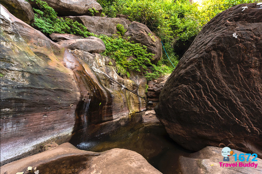 จากนั้นจะเป็นเส้นทางเดินป่า ระยะทางประมาณ 500 เมตร ซึ่งเส้นทางนี้เป็นเส้นทางธรรมชาติต้องใช้ความระมัดระวังในการเดินพอสมควร ซึ่งช่วงที่ลาดชัน ทางอุทยานฯ มีการขึงเชือกไว้ให้จับ สลับกับมีบันไดเล็ก ๆ ให้ปีนเป็นระยะ ๆ เพื่ออำนวยความสะดวกในการเดินขึ้นไปนั่นเอง