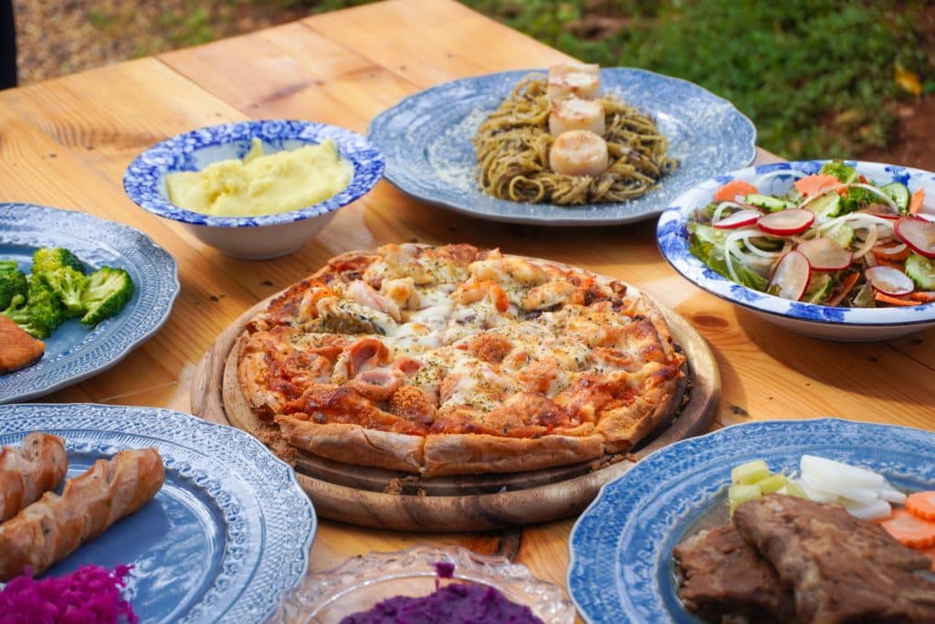 นอกจากบรรยากาศดีแล้ว เรื่องอาหารของที่นี่ก็ไม่เป็นรอง หากใครไม่ได้มาพัก แต่อยากมาชิมอาหาร ก็ติดต่อจองมาได้เช่นกัน ป้าติ๋มจะจัดเตรียมอาหารตามจำนวนคนที่มา เป็นเมนูสไตล์ยุโรป-อิตาเลียนและทำสดใหม่ อาจจะใช้เวลารอหน่อย แต่อร่อยแน่นอน ทั้งนี้ ไส้กรอก เครื่องเคียงและผักดอง แยมรสต่าง ๆ ที่นี่ก็ทำเองด้วยนะ และที่ห้ามพลาด ตบท้ายด้วยไอศกรีมบลูเบอร์รี่โฮมเมด อร่อยสุด ๆ