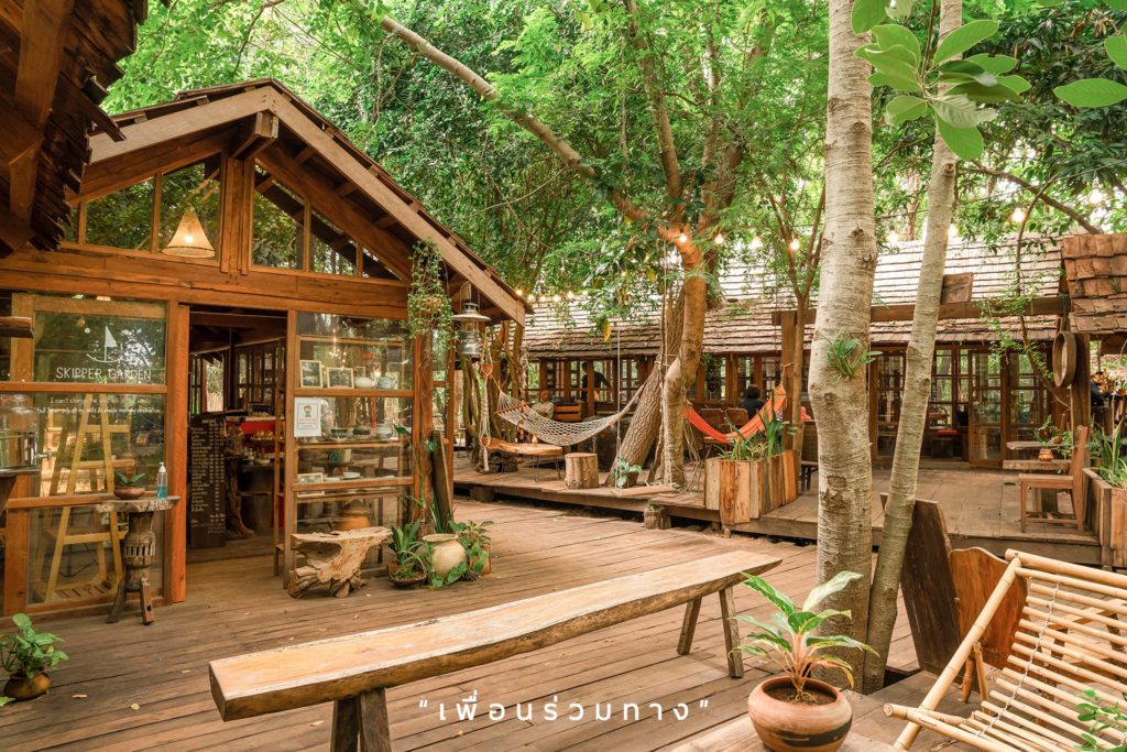 กิ่งปลูกปั้น Skipper Garden ขึ้นเพราะต้องการให้แขกไปใครมาได้รับพลังบวกจากต้นไม้พวกนี้ วางตัวเป็นแหล่งชาร์จแบตธรรมชาติ เปิดพื้นที่ป่ากลางเมืองให้ทุกคนมาพักผ่อนหย่อนใจ จิบกาแฟ นอนเปล รับลมกลางวันอุ่น ๆ มีสุมทุมพุ่มไม้เป็นเครื่องกีดกั้นความเครียดทิ้งไปตั้งแต่หน้าร้าน ร่มไทรใบบังเป็นร่มกางกั้นแสงแดดให้ต้องผิวแต่พอดี