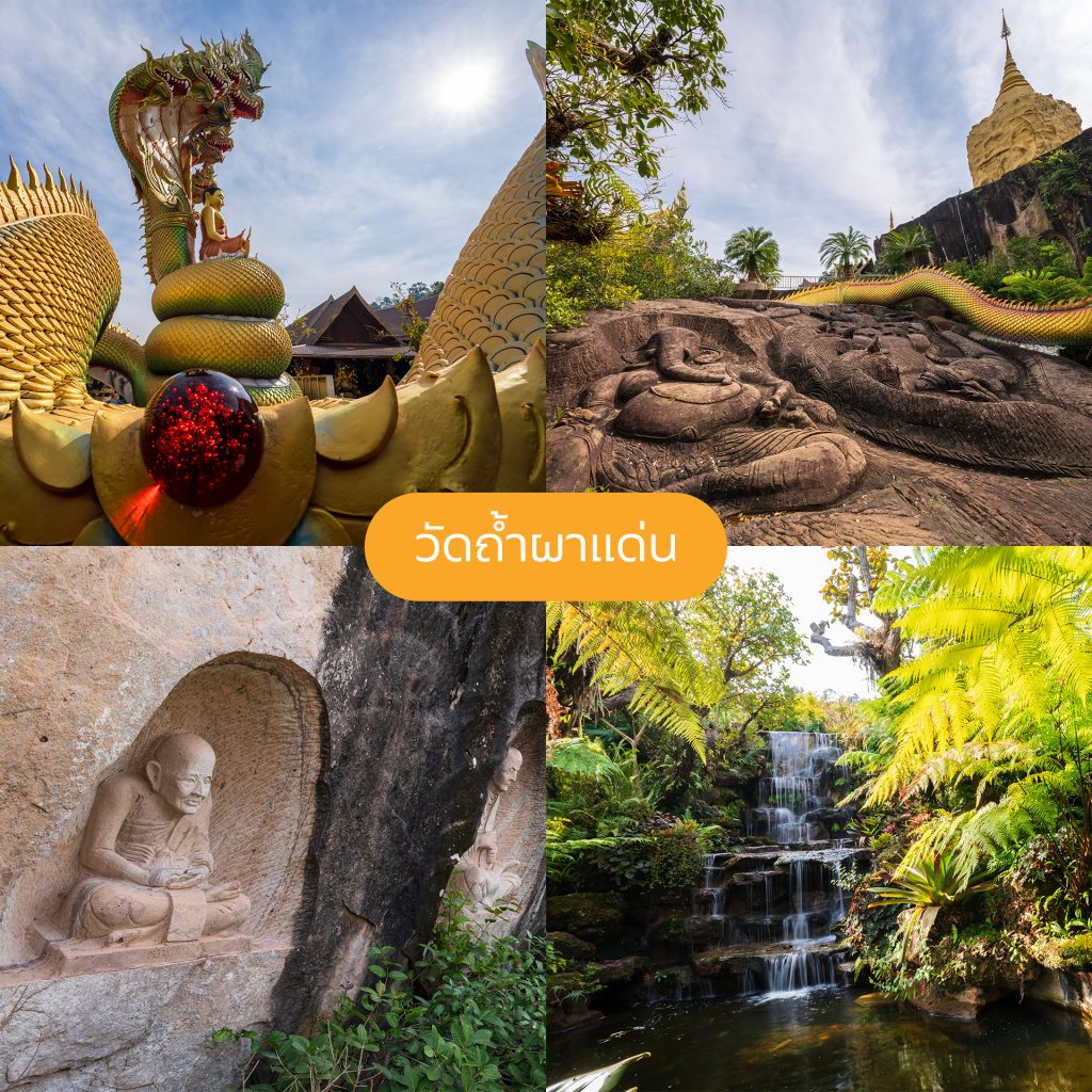 อิ่มท้องแล้วต้องอิ่มใจ บัดดี้เลยพาเพื่อน ๆ ไปต่อกันที่ วัดถ้ำผาแด่น วัดสวยที่ตั้งอยู่บนเขา ภายในบริเวณวัดร่มรื่น ประดิษฐานพญานาคสีทองสวยให้ผู้ที่มีจิตศรัทธาได้สักการะ