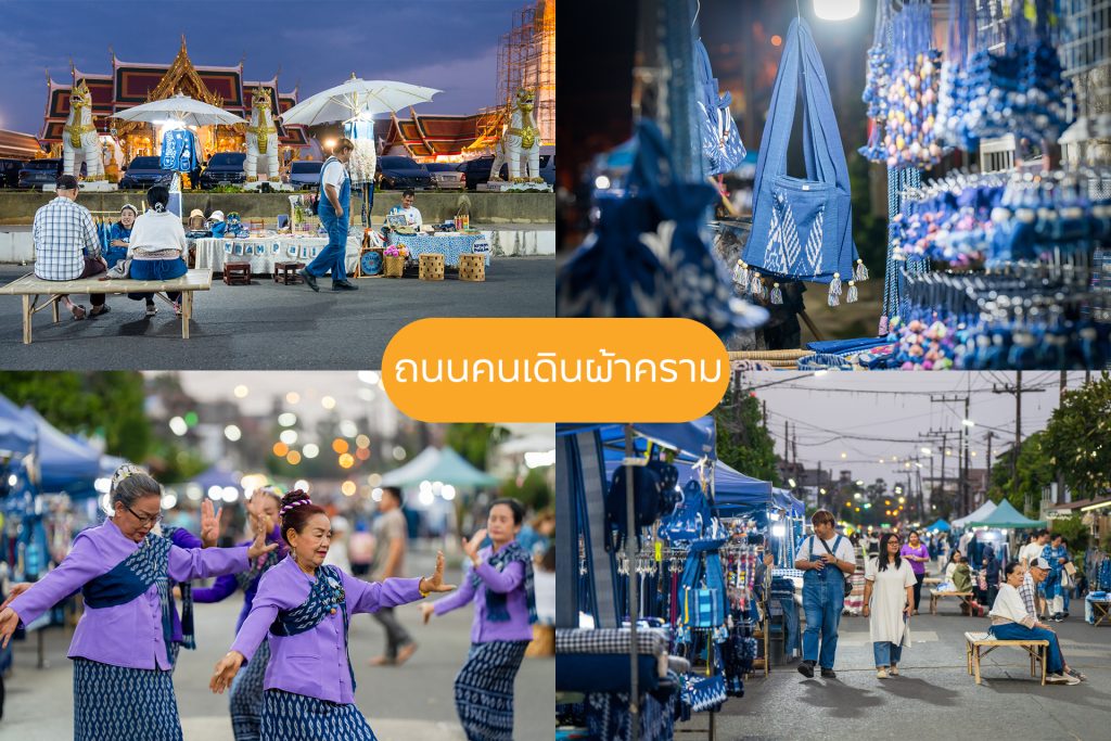 ทุกวันเสาร์-อาทิตย์ ถนนบริเวณหน้าวัด จะแปรเปลี่ยนเป็น ถนนคนเดินผ้าคราม มีสินค้าที่ทำจากผ้าครามมาจำหน่ายในหลากหลายรูปแบบ ไม่ว่าจะเป็นเสื้อผ้า กระเป๋า หมวก เพื่อน ๆ สามารถเลือกซื้อมาแต่งตัวเหมือนน้อง ๆ Huuyaow และ WorldBoy ได้