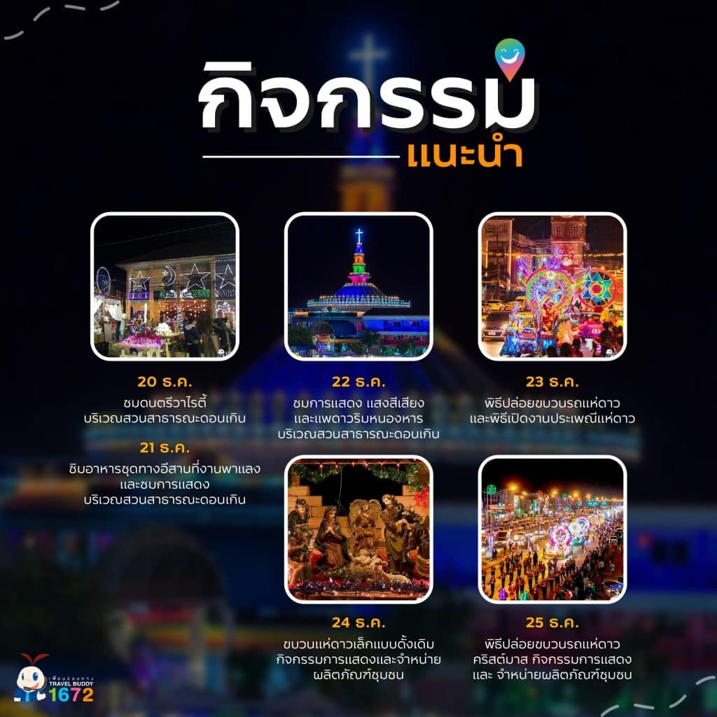 ที่สำคัญ ในวันที่ 26 ธันวาคม พบกับขบวนรถแห่ดาว ณ โบสถ์คริสต์นิกายโรมันคาทอลิก สักการสถานพระมารดาแห่งมรณสักขี วัดสองคอน จังหวัดมุกดาหาร ใครสนใจสามารถตามไปดูได้