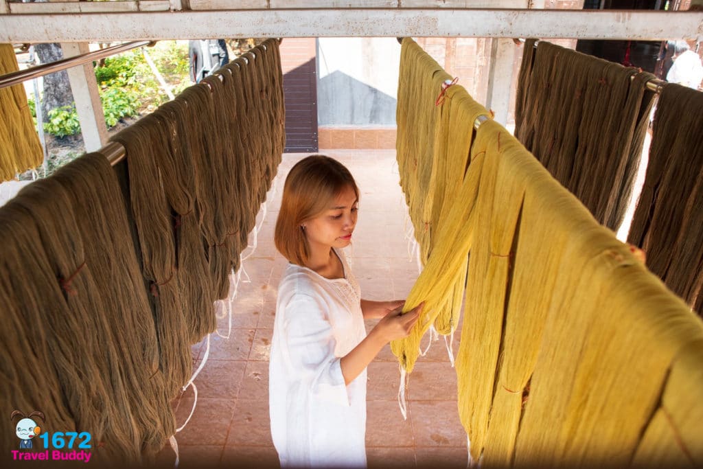 อย่างที่กล่าวไป เอกลักษณ์ของที่นี่คือการนำดอกบัวแดงที่ขึ้นเยอะในพื้นที่มาใช้เป็นวัตถุดิบย้อมสี ย้อมเส้นฝ้าย และเส้นไหม ซึ่งแต่ละส่วนของดอกบัวก็จะให้สีที่แตกต่างกัน ส่วนดอกบัวตากแห้งจะให้สีน้ำตาลทอง สายบัวให้สีเทาเงิน กลีบบัวให้สีชมพู เพื่อทำให้ได้สีหลากหลาย จึงมีการนำส่วนผสมอื่น ๆ เข้าใช้ร่วม เช่น หากใช้น้ำปูนกับน้ำมะขามเปียกผสมจะได้สีเขียวขี้ม้า เป็นต้น แต่ที่นิยมมากในตอนนี้ก็คือนำมาหมักโคลน