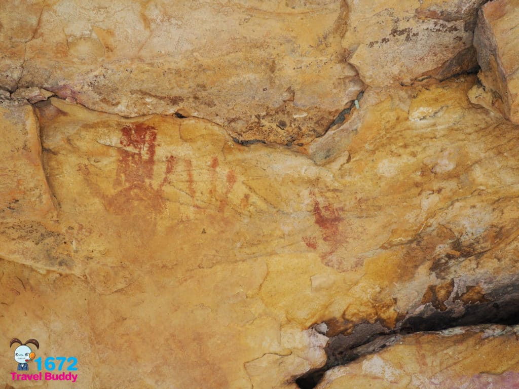 หากสังเกตดี ๆ จะเห็น “รอยฝ่ามือแดง” ปรากฏให้เห็นตรงหินก้อนใหญ่ สำหรับรอยฝ่ามือแดงนี้ ทางกรมศิลปากรได้เข้าไปตรวจสอบและมีผลยืนยันแล้วว่ามีอายุประมาณ 2,500 ปี โดยมีอายุใกล้เคียงกับผาแต้มที่จังหวัดอุบลราชธานีทีเดียว