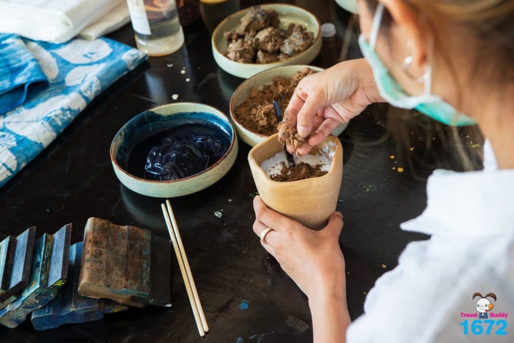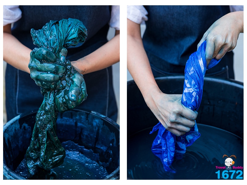 ขั้นตอนการย้อมครามนี้สนุกสุด ๆ แต่ต้องระวังเปื้อนกันด้วยน้า ตลอดการเวิร์กช็อป อาจารย์เนศและอาจารย์หยก จะคอยแนะนำและบอกเล่าความรู้ของการย้อมครามให้เราได้ฟังกัน