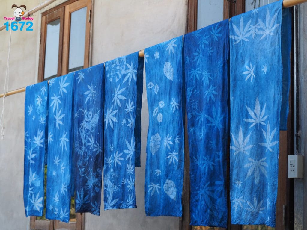 เสร็จแล้ว! นี่คือหน้าตาของการทำบาติก ย้อมครามสีธรรมชาติ เพื่อน ๆ สามารถเลือกชนิดของชิ้นงานที่จะนำมาย้อมได้ มีทั้งผ้าคลุมไหล่ ผ้าพันคอ เสื้อ กางเกง ฯลฯ