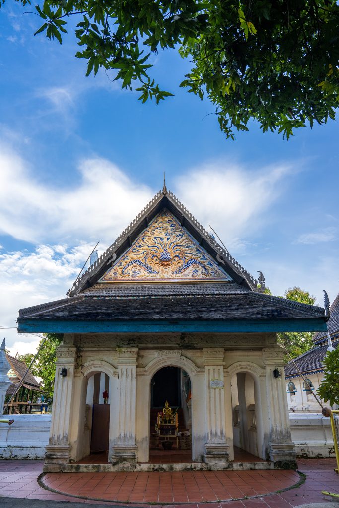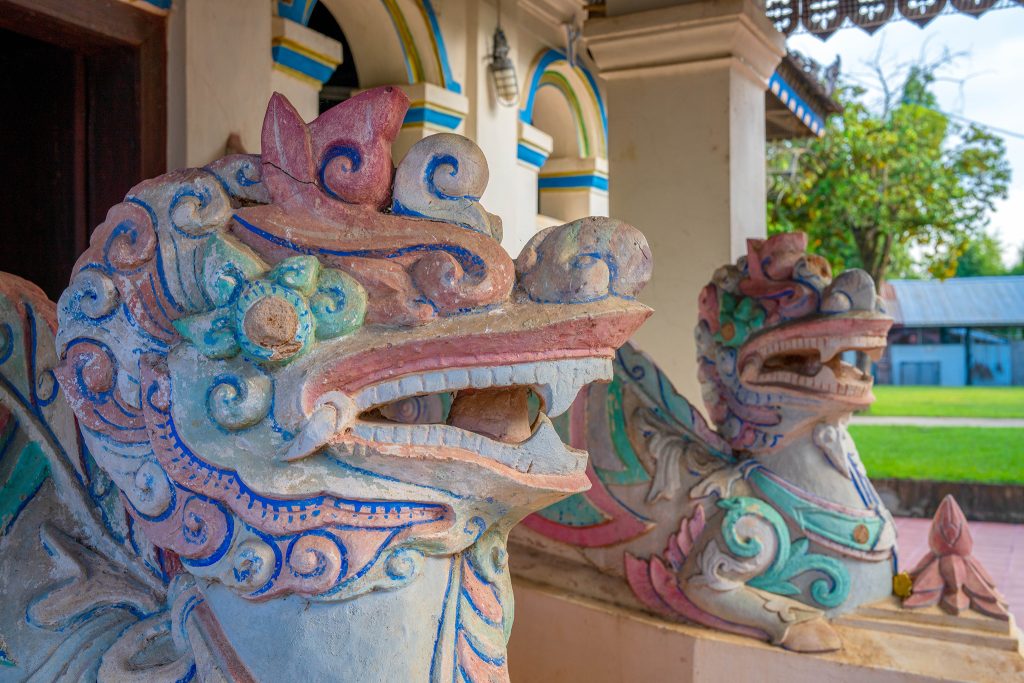 สะดุดตากับหน้าบัน มีลวดลายคล้ายมังกรพ่นน้ำเป็นศิลปะแบบช่างญวนเช่นเดียวกัน เมื่อสองวัฒนธรรมร่วมกันสร้าง ทำให้พุทธศิลป์ที่ถ่ายทอดออกมาแปลกตาแต่งดงามไม่ใช่น้อย บันไดทางขึ้นก็มีศิลปะปูนปั้นเป็นรูปคล้ายพญานาคผสมมังกร เหนือบานประตูทางเข้ามีภาพวาดพระพุทธรูปด้วย ในส่วนบริเวณด้านหลังอุโบสถ หน้าบันเป็นรูปหัสดีลิงค์ในป่าหิมพานต์ ลวดลายงดงาม หากมาชมด้วยตาตัวเองต้องประทับใจสุด ๆ