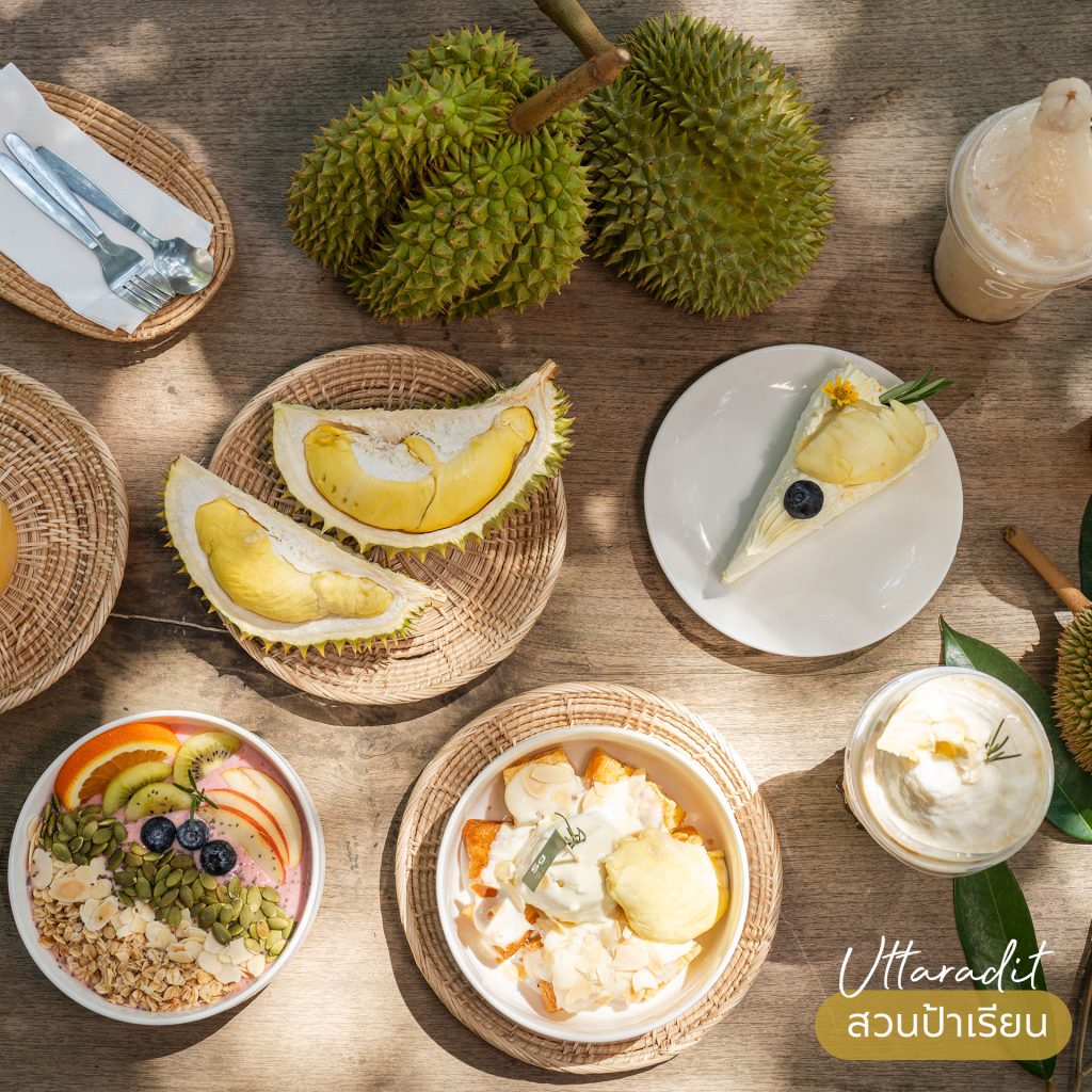 จุดเช็กอินยอดฮิตของสวนป้าเรียน ก็คือ คาเฟน่ารักกลางสวนทุเรียนอย่าง “Summer Green Cafe” ซึ่งอยู่บริเวณด้านข้างตัวบาน ที่นี่มีเมนูพิเศษที่รังสรรค์มาจากผลไม้ตามฤดูกาลที่ปลูกไว้รอให้เพื่อน ๆ มาลิ้มลอง โดยเฉพาะชาวทุเรียน Lover ทั้งเมนูเครื่องดื่มและไอศกรีมผลไม้โฮมเมด เช่น ทุเรียน มะยงชิด ลองกอง เมนูของหวานอย่างชีสเค้กทุเรียน เฉาก๊วยทุเรียนนมสด วาฟเฟิลโบลไอศกรีมทุเรียนมะพร้าว ทุเรียนคาราเมลมิลค์เชค เฉาก๊วยทุเรียนนมสด ทุเรียนคาราเมลมิลค์เชค ซึ่งจัดตกแต่งแต่ละเมนูออกมาได้ดูสวย ดูดี และเหมาะกับการถ่ายรูปมาก ๆ ถ้าเพื่อน ๆ มีโอกาสมาเที่ยวอุตรดิตถ์ ก็อย่าลืมแวะมาเที่ยว แวะมาชิม และก็แวะมาลิ้มรสความอร่อยของเมนูต่าง ๆ กันที่นี่นะ บัดดี้บอกเลยว่า…ของเขาดีจริง ๆ