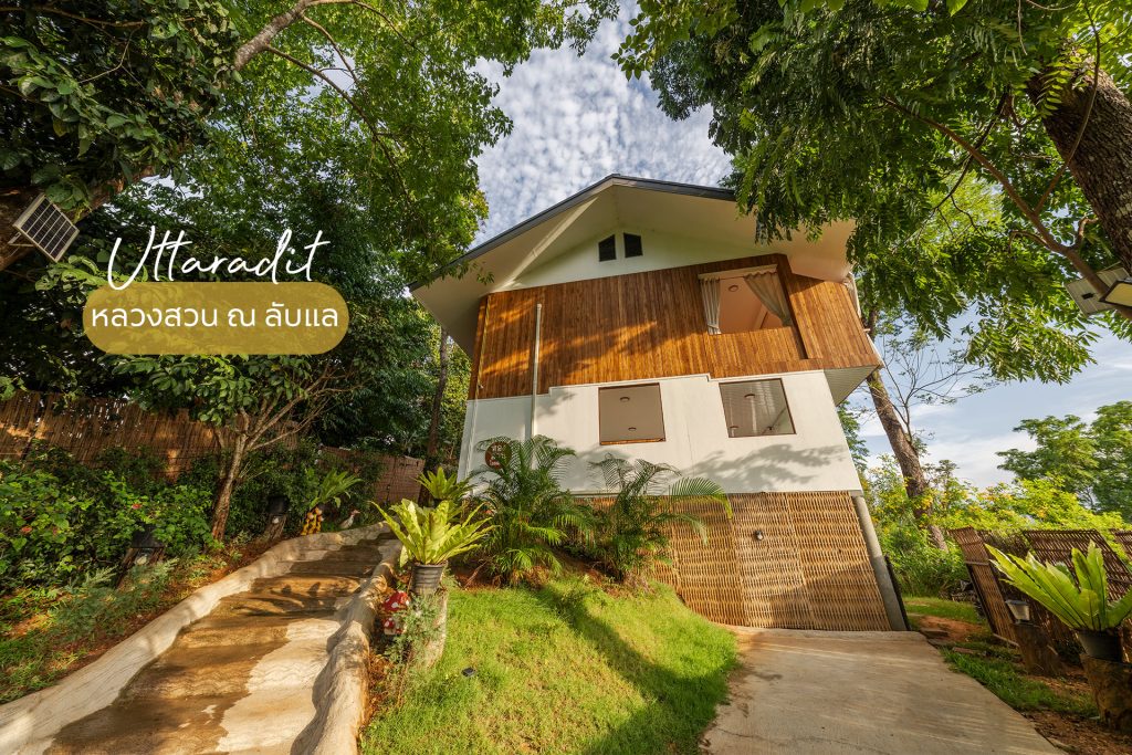 บ้านไม้ยกพื้นสูงท่ามกลางสวนผลไม้อย่างทุเรียนในลับแล จังหวัดอุตรดิตถ์ ดัดแปลงพื้นที่บริเวณใต้ถุนบ้านมาเป็นสถานที่จำหน่ายทุเรียนสายพันธุ์หลง-หลินลับแล และผลไม้ตามฤดูกาล เช่น มะยงชิต มังคุด ท่ามกลางบรรยากาศร่มรื่นของผลไม้ที่ปลูกโดยรอบ เพื่อน ๆ สามารถเดินเล่นชมสวนและถ่ายรูปสวย ๆ กับผลไม้