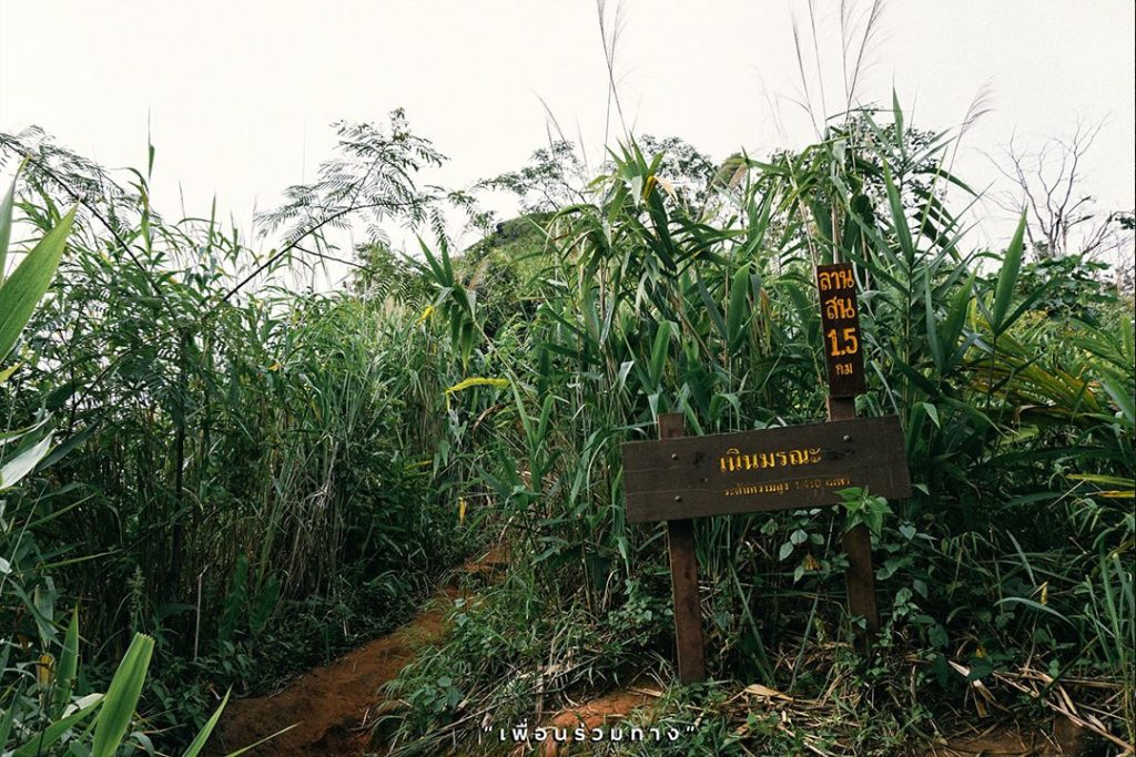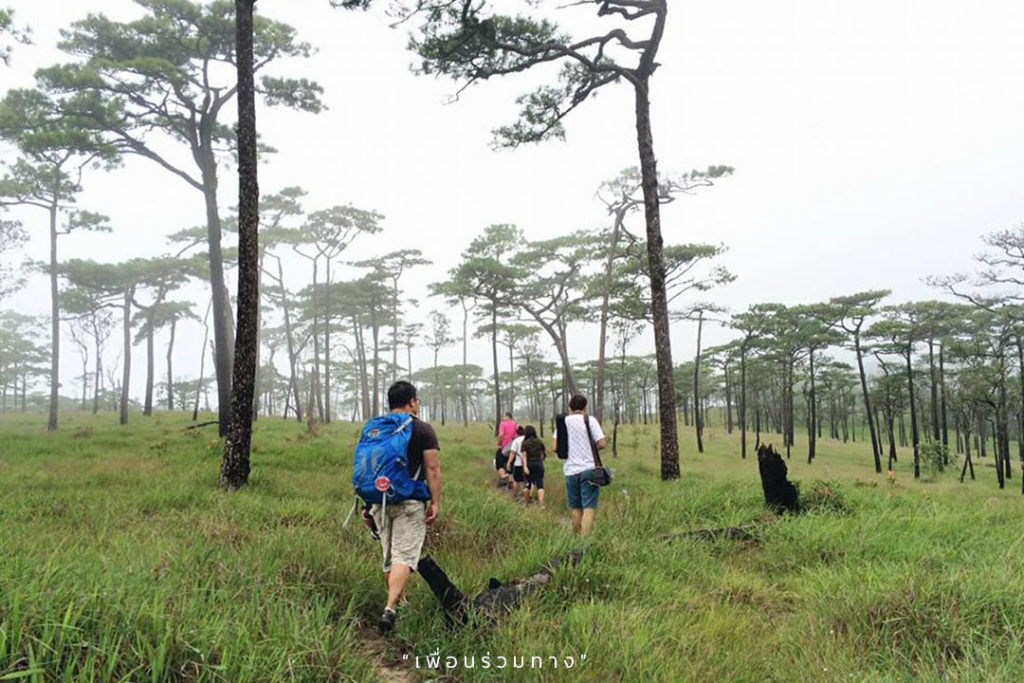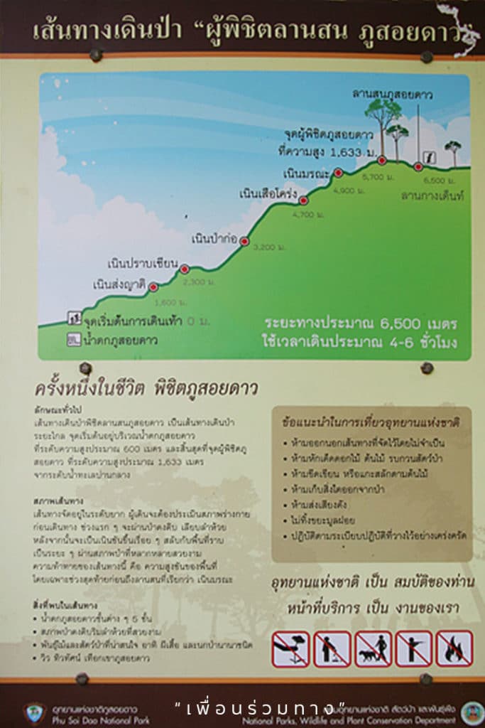 จากนี้ต้องตั้งใจเดินแล้วละนะ จุดหมายของแอดคือ “ลานสนสามใบภูสอยดาว” ซึ่งแอดขอแนะนำ ว่าควรออมแรงกันไว้หน่อยนะ เพราะกว่าจะถึงจุดหมาย ต้องเดินเท้าเป็นระยะทางประมาณ 6.5 กิโลเมตร ผ่านเนินต่าง ๆ ถึง 5 เนิน ที่มีชื่อแสนจะไม่ต้อนรับ คือ เนินส่งญาติ, เนินปราบเซียน, เนินป่าก่อ, เนินเสือโคร่ง และเนินมรณะ