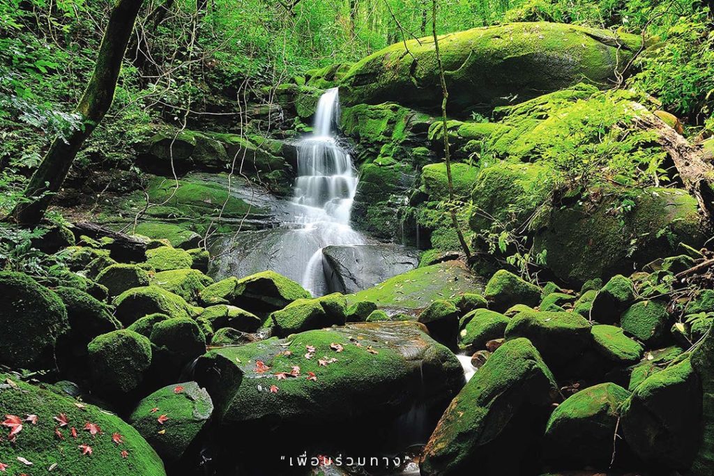 หลังจากนั่งรถของเจ้าหน้าที่มาตรงจุดเริ่มต้น เพื่อน ๆ จะพบกับ “น้ำตกภูสอยดาว” เป็นเหมือนสถานที่ต้อนรับในตอนแรก โดยน้ำตก่จะมีทั้งหมด 5 ชั้น ชื่อไพเราะคล้องจองกันว่า ภูสอยดาว สกาวเดือน เหมือนฝัน กรรณิการ์ และสุภาภรณ์ มีน้ำไหลตลอดทั้งปี สภาพป่าโดยรอบน้ำตกจึงมีความชุ่มชื้นมาก มีมอสส์ขึ้นปกคลุมตามก้อนหินริมน้ำสวยงาม