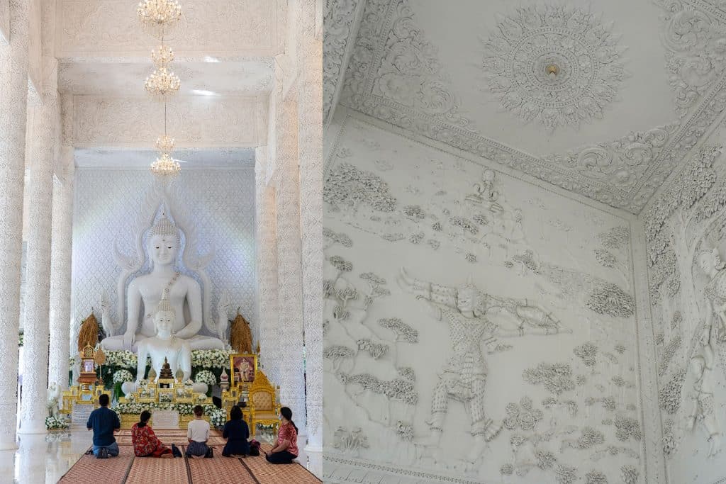 พระอุโบสถสีขาว ที่ทางขึ้นเป็นบันไดนาคสวยงาม ประดับด้วยลวดลายปูนปั้นทั้งหลัง ภายในประดิษฐานองค์พระพุทธรูปสีขาวองค์ใหญ่